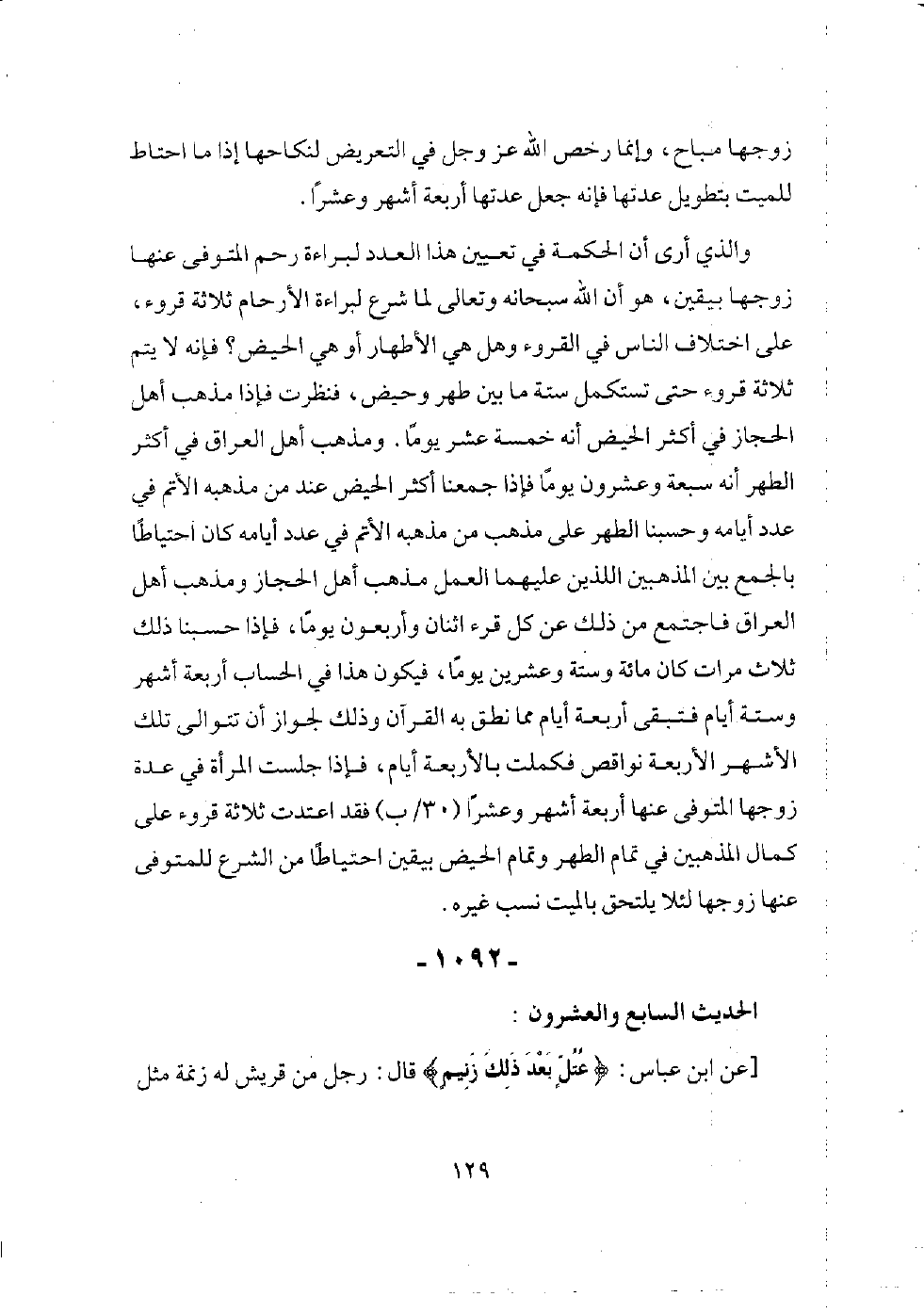 (عن ابن عباس، قال: (يطوف (29/ب) الرجل بالبيت ما كان حلالاً، حتى يُهلَّ بالحج، فإذا ركب إلى عرفة فمن تيسر له هديه من الإبل أو البقر أو الغنم، ما تيسر له من ذلك، أي ذلك شاء، غير أنه إن لم يتيسر له فعليه ثلاثة أيام في الحج، وذلك قبل يوم عرفة، فإن كان آخر يوم من الأيام الثلاثة يوم عرفة فلا جناح عليه، ثم لينطلق حتى يقف بعرفات من صلاة العصر إلى أن يكون الظلام، ثم يدفعون إلى عرفات، فإذا أفاضوا حتى يبلغوا جمعًا الذي