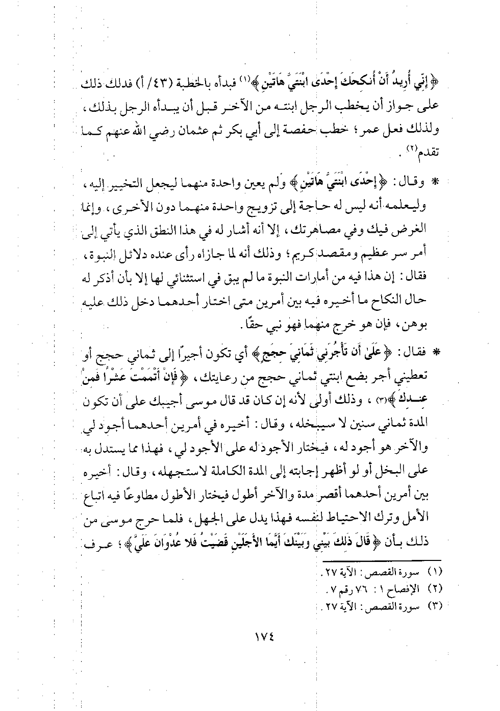 * في هذا الحديث ما يدل على أن موسى عليه السلام احترز في نطقه بما لو قضى معه أدنى الأجلين لم يكن مخالفًا لما وعد به، ثم إنه قضى الأفضل، فجمع في ذلك بين احترازه لقوله وبين وفائه بأكمل وعديه؛ وذلك أن هذه الآيات مما تدل على أن القرآن قول فصل وليس بالهزل، وذلك قوله عز وجل: {ولما ورد ماء مدين وجد عليه أمة من الناس}، ولم يقل وجد عليه قومًا؛ لأن الأمة تشمل الرجال والنساء والصغار والكبار والشيوخ والشبان.