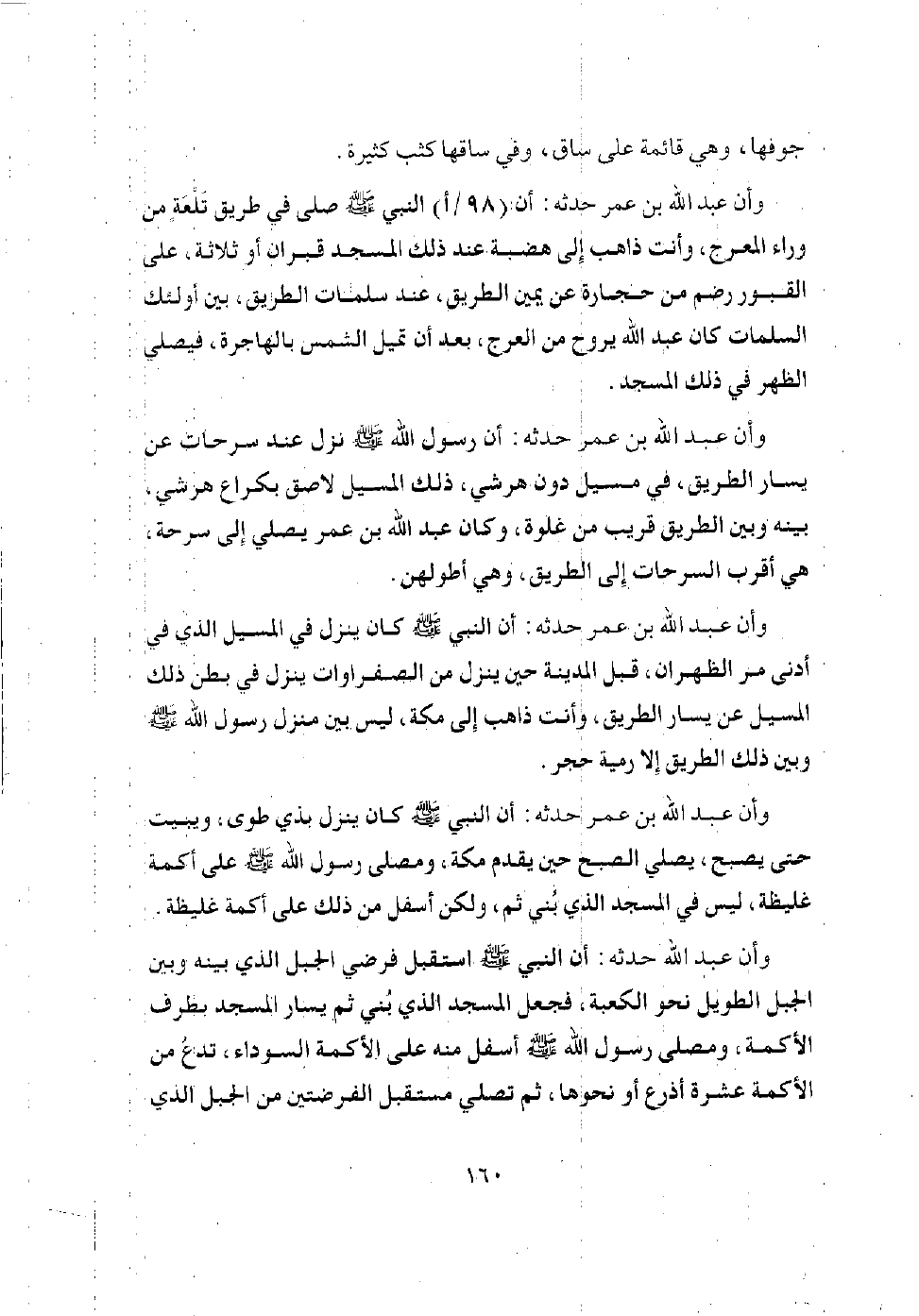 [عن ابن عمر، أن رسول الله - صلى الله عليه وسلم - كان ينزل بذي الحليفة حين يعتمر، وفي حجته حين حج، تحت سمرة في موضع المسجد الذي بذي الحليفة، وكان إذا رجع من غزو، فكان في تلك الطريق، أو في حج أو عمرة، هبط من بطن