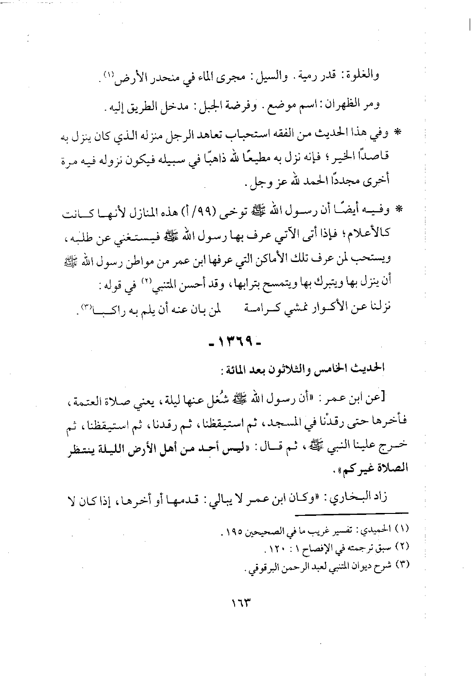 وفي رواية للبخاري من حديث موسى بن عقبة، قال: (رأيت سالم بن عبد الله يتحرى أماكن من الطريق فيصلي فيها، ويحدث أن أباه كان يصلي فيها، وأنه رأى النبي - صلى الله عليه وسلم - يصلي في تلك الأمكنة).