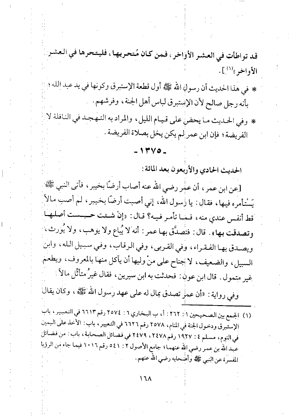 [عن ابن عمر، قال: (كان رسول الله - صلى الله عليه وسلم - يعتكف العشر الأواخر من رمضان. وقال نافع: أراني عبد الله المكان الذي كان يعتكف فيه رسول الله - صلى الله عليه وسلم - من المسجد)].