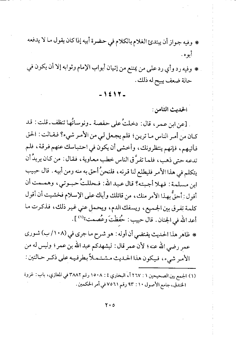 [عن سالم، قال: كتب عبد الملك إلى الحجاج: أن لا تخالف ابن عمر في الحج، فجاء ابن عمر -وأنا معه يوم عرفة- حين زالت الشمس، فصاح عند سرادق الحجاج فخرج وعليه ملحفة مصفرة، فقال: ما لك يا أبا عبد الرحمن؟ فقال: الرواح؛ إن كنت تريد السنة. فقال: هذه الساعة؟ قال: نعم، قال: فأنظرني حتى أفيض على رأسي ماء (108/أ) ثم أخرج، فنزل حتى خرج الحجاج، فسار بيني وبين أبي، فقلت: إن كنت تريد السنة، فاقصر