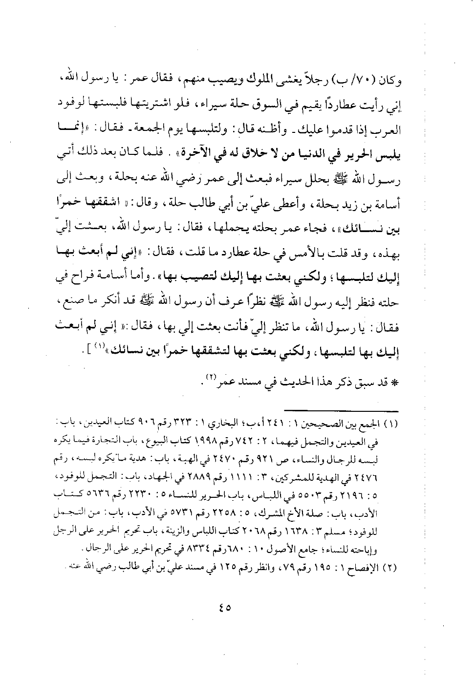 [عن ابن عمر، قال: وجد عمر حلة من إستبرق تباع بالسوق، فأخذها فأتى بها رسول الله - صلى الله عليه وسلم -، فقال يا رسول الله: ابتع هذه، فتحمل بها للعيد