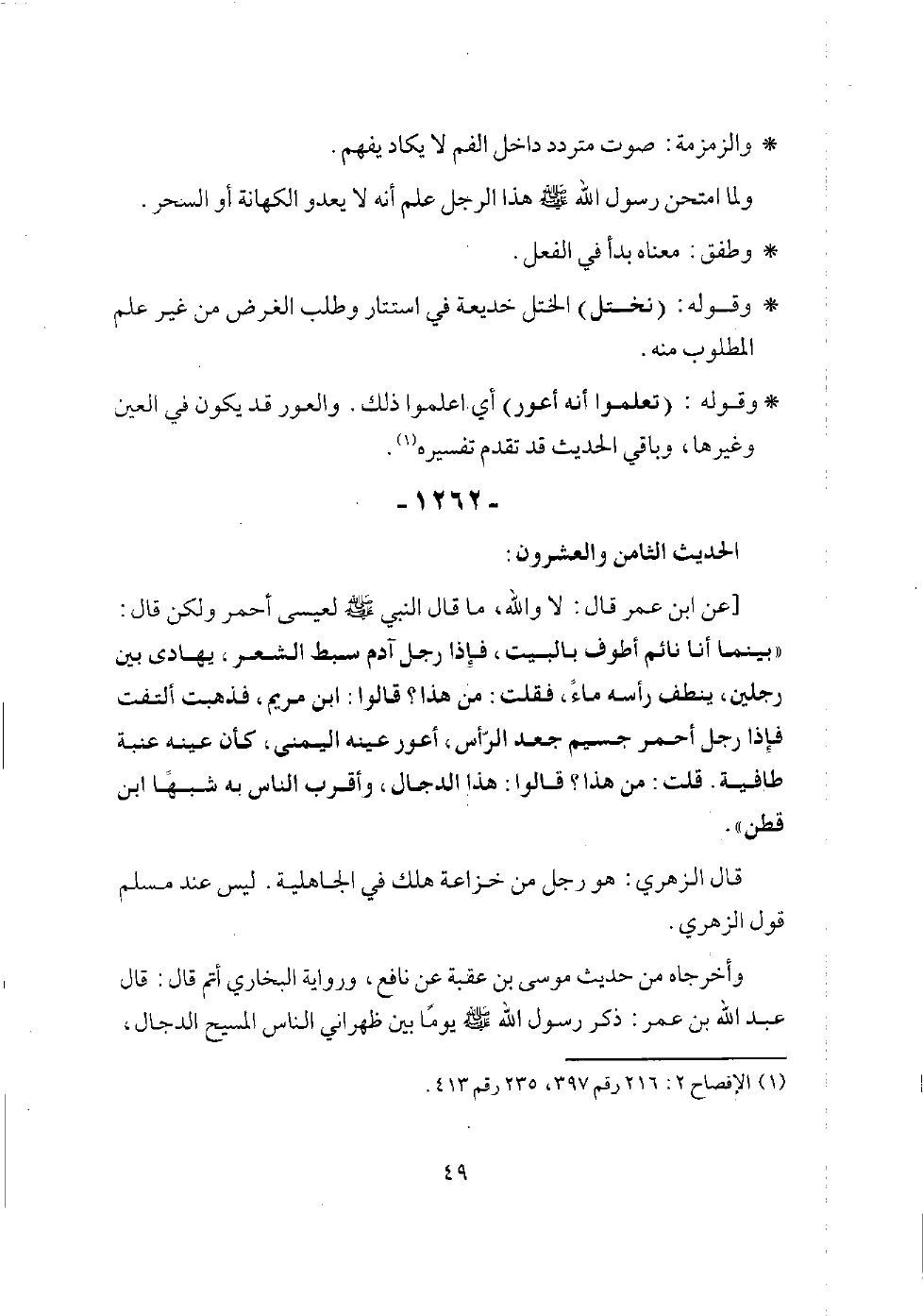 [عن ابن عمر، (أن عمر بن الخطاب رضي الله عنه انطلق مع رسول الله - صلى الله عليه وسلم - في رهط من أصحابه قبل ابن صياد، حتى وجدوه يلعب مع الصبيان، عند أطم بني مغالة، وقد قارب ابن صياد يومئذ الحلم، فلم يشعر حتى ضرب رسول الله - صلى الله عليه وسلم - (71/أ) ظهره بيده، ثم قال رسول الله - صلى الله عليه وسلم - لابن صياد: أتشهد أني رسول الله؟ فنظر إليه ابن صياد، فقال: أشهد أنك رسول الله الأميين، فقال ابن صياد لرسول الله - صلى الله عليه وسلم - أتشهد أني رسول الله؟ فرفضه النبي - صلى الله عليه وسلم - وقال: (آمنت بالله وبرسله)، ثم قال له رسول الله: ماذا ترى؟ قال ابن صياد: يأتيني صادق وكاذب، فقال رسول الله - صلى الله عليه وسلم -: (خلط عليك الأمر)، ثم قال له رسول الله - صلى الله عليه وسلم -: (إني قد خبأت لك خبيئًا)، فقال ابن صياد: وهو الدخ، فقال له رسول الله - صلى الله عليه وسلم -: (اخسأ، فلن تعدو قدرك). فقال عمر بن الخطاب: ذرني يا رسول الله أضرب عنقه؛ فقال له رسول الله - صلى الله عليه وسلم -: (إن يكنه فلن تسلط عليه، وإن لم تكنه فلا خير لك في قتله).