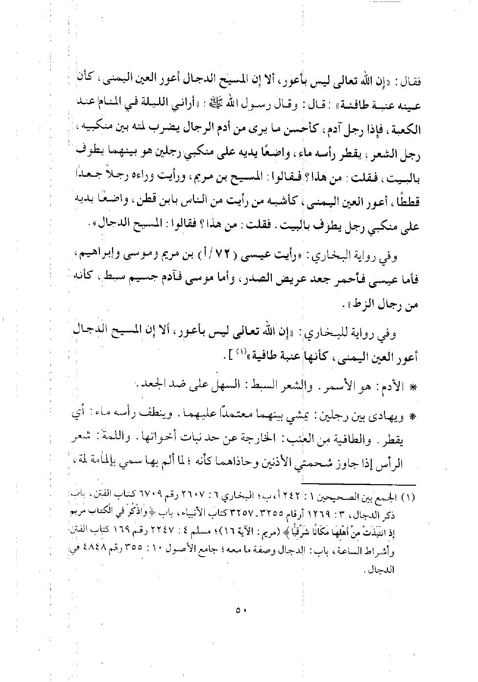 قال سالم: قال عبد الله بن عمر: فقام رسول الله - صلى الله عليه وسلم - في الناس، فأثنى على الله بما هو له أهله، ثم ذكر الدجال فقال: (إني لأنذركموه، ما من نبي إلا قد أنذره قومه، لقد أنذره نوح قومه، ولكني أقول لكم فيه قولًا لم يقله نبي لقومه: تعلمون أنه أعور، وإن الله تبارك وتعالى ليس بأعور).