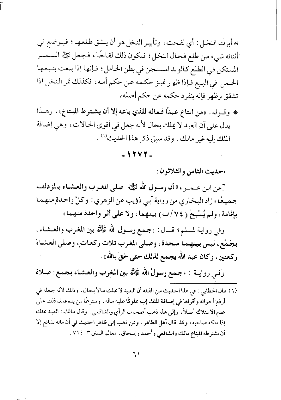 وفي رواية: (من اشترى طعامًا فلا يبيعه حتى يستوفيه، وقال: وكنا نشتري الطعام من الركبان جزافًا، فنهانا رسول الله - صلى الله عليه وسلم - أن نبيعه حتى ننقله من مكانه.
