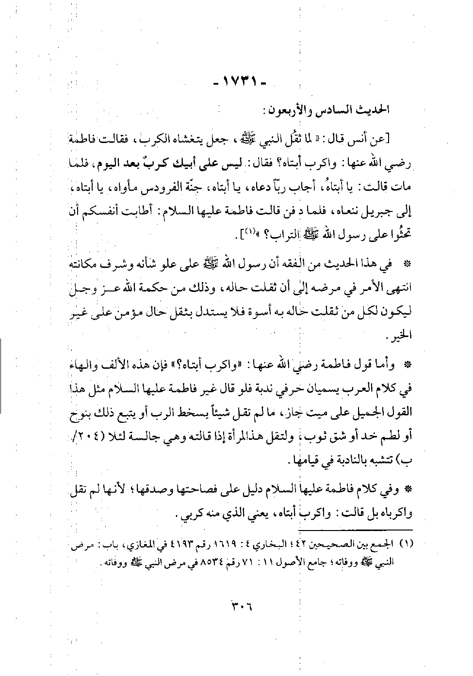* وفيه أيضًا أن أم حارثة لعزة حارثة عليها أرادت أن تعلم حاله في آخرته، فإن كان قد فاز بالدخول إلى الجنة لم يكن لحزنها موقع، وإن كان ضد ذلك كان حزنها عليه في موضعه، فأخبرها رسول الله - صلى الله عليه وسلم - بأنها جنات.