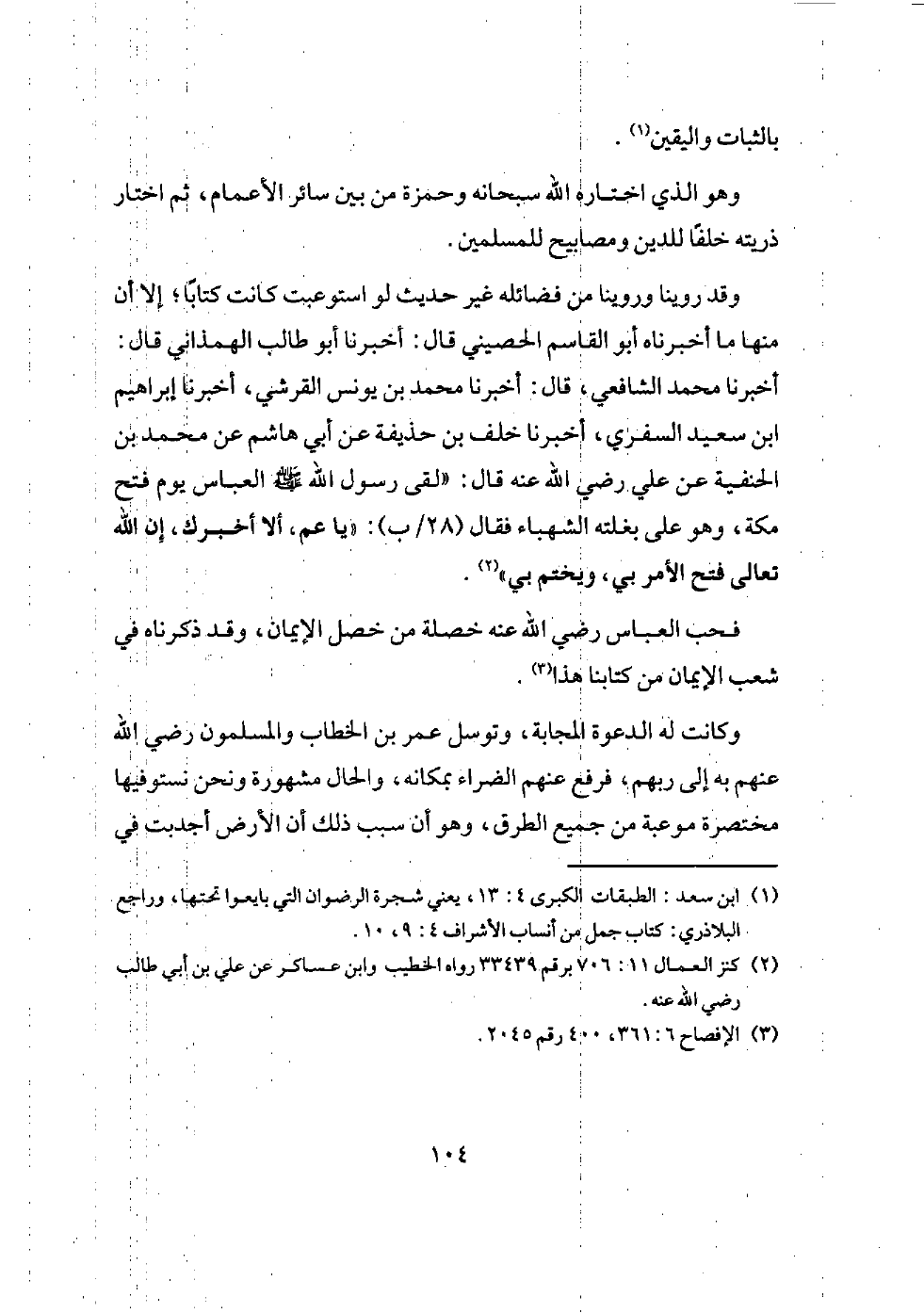 وكان العباس أنصر الناس لرسول الله - صلى الله عليه وسلم -، وأحدبهم عليه بعدما مات عمه أبو طالب، والذي ذهب إليه محققوا علمائنا أن العباس رضي الله عنه أسلم قبل فتح خيبر، وإنما كان يكتم إسلامه لمصلحة الدين، وأن يخبر رسول الله - صلى الله عليه وسلم - ويكاتبه بأحوال المسلمين، ويدل على ذلك ويوضحه حديث الحجاج بن علاط، وهو بين لمن تدبره، ولما ظهر إسلامه حين أظهره، عضد