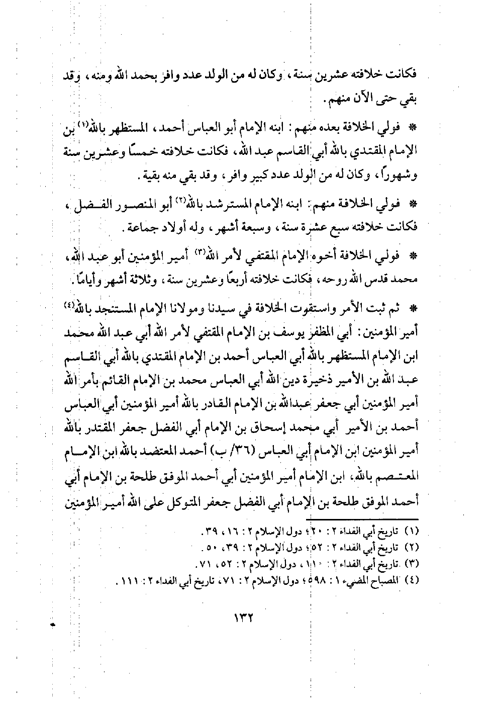 * ثم ولي الخلافة بعد ابن أخيه: أبو العباس محمد الراضي بالله، وجعفر المقتدر بالله، فكانت خلافته ست سنين وعشرة أشهر وأيامًا، وكانت له عدة أولاد: أحمد، وعبد الله، وغيرهما.