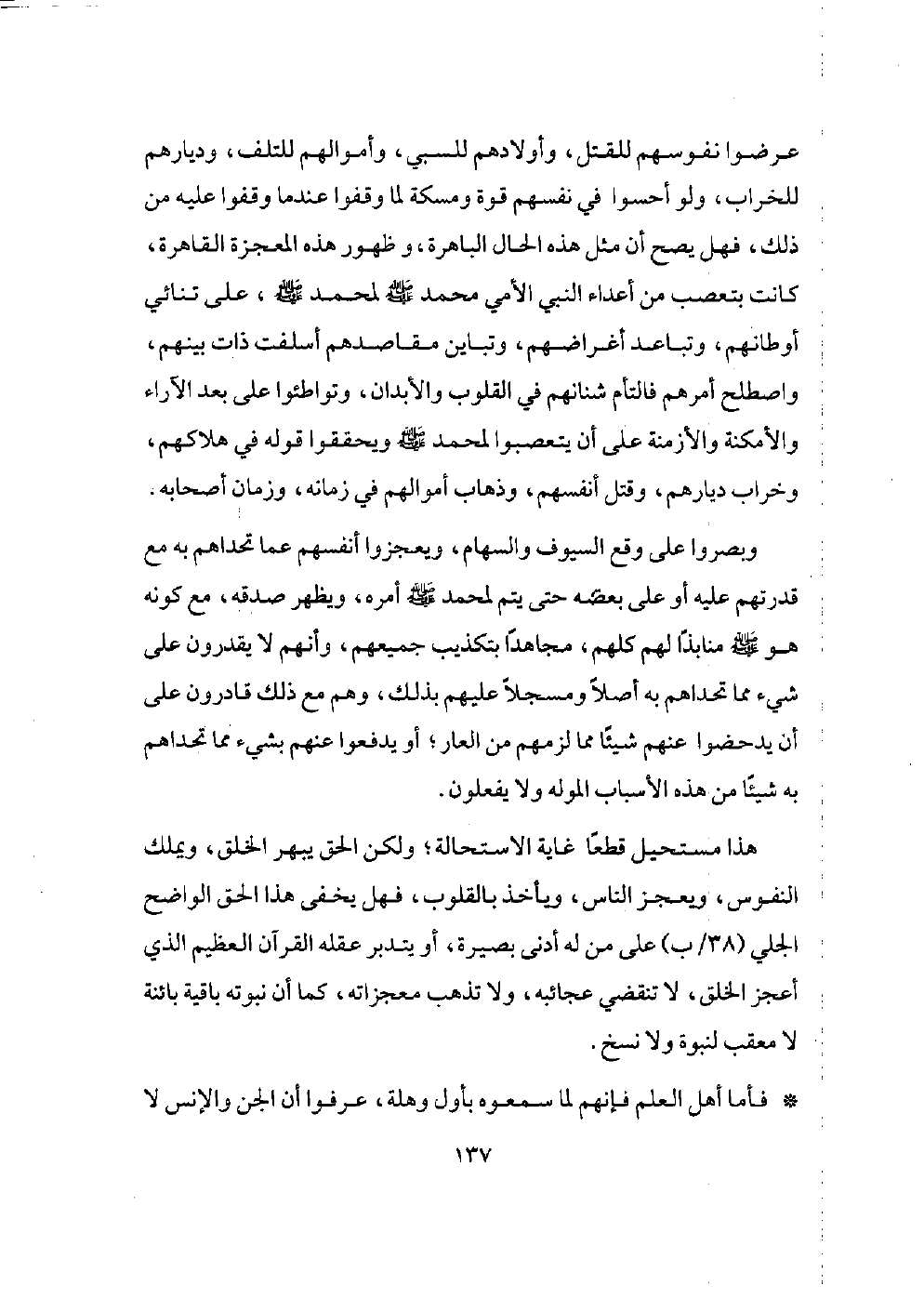 فهو قد جمع الله له - صلى الله عليه وسلم - بين معجزات الأنبياء كلهم، فإن الله سبحانه جعل دلائله قوله وبرهانه كلامه، فصدق الله به وعوده، ونفذ به أوامره، فقال سبحانه وتعالى: {وعد الله الذين آمنوا منكم وعملوا الصالحات ليستخلفنهم في الأرض كما استخلف الذين من قبلهم وليمكنن لهم دينهم الذي ارتضى لهم وليدلنهم من بعد خوفهم أمنا يعبدونني لا يشركون بي شيئًا ومن كفر بعد ذلك فأولئك هم الفاسقون}.
