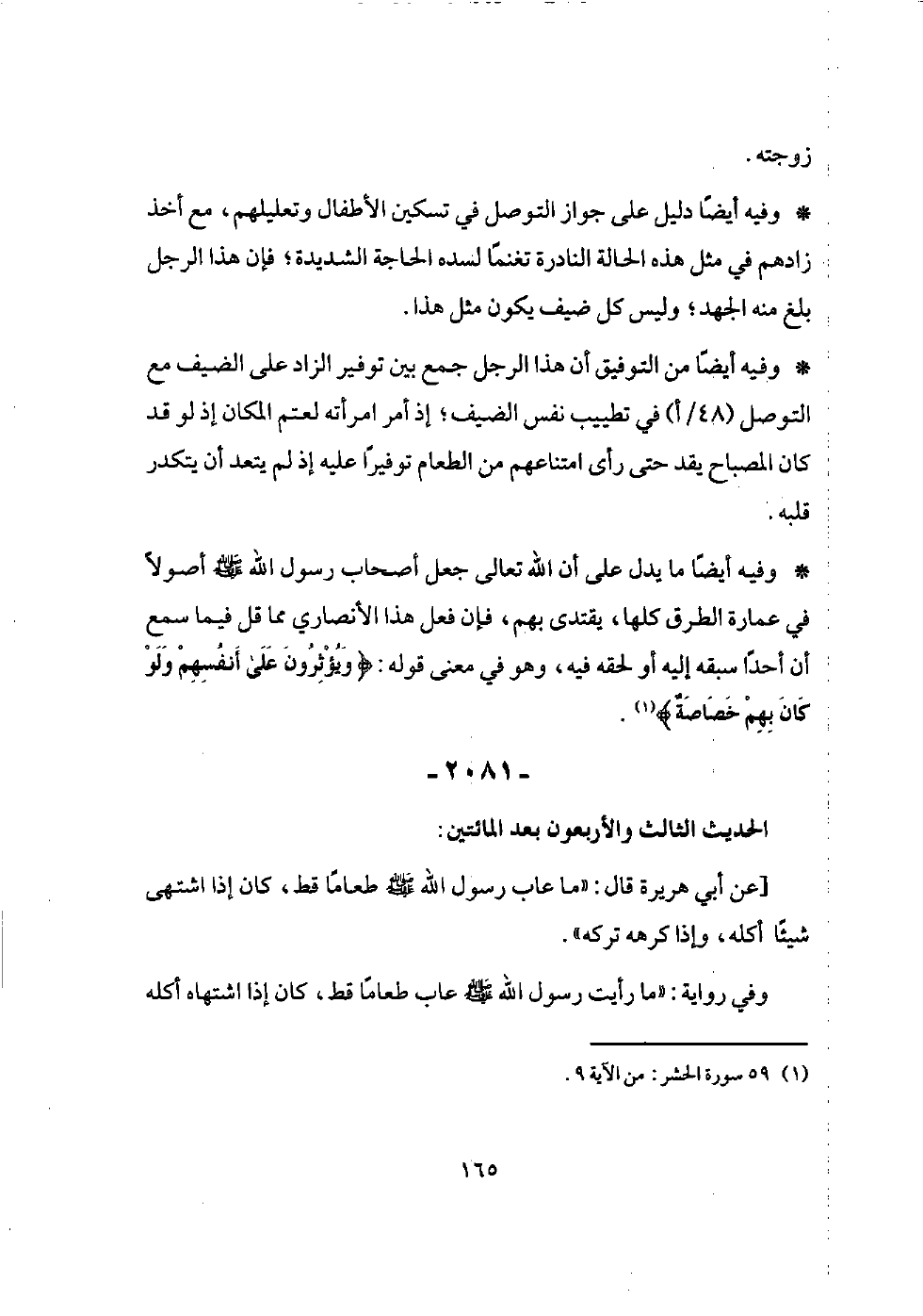 [عن أبي هريرة، قال: جاء رجل إلى النبي - صلى الله عليه وسلم - فقال: إني مجهود، فأرسل إلى بعض نسائه، فقالت: والذي بعثك بالحق ما عندي إلا ماء، ثم أرسل إلى أخرى، فقالت مثل ذلك، حتى قلن كلهن مثل ذلك؛ لا، والذي بعثك بالحق ما عندي إلا الماء، فقال: (من يضيف هذا الليلة؟ فقام رجل من الأنصار، فقال: أنا يا رسول الله، فانطلق به إلى رحله، فقال لامرأته: أكرمي ضيف رسول الله - صلى الله عليه وسلم -).