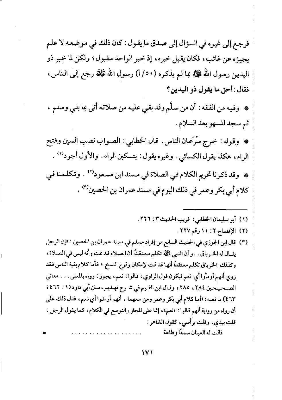 وفي رواية لمسلم: (صلى بنا رسول الله - صلى الله عليه وسلم - صلاة العصر، فسلم في ركعتين، فقام ذو اليدين فقال: أقصرت الصلاة يا رسول الله أم نسيت؟ فقال رسول الله - صلى الله عليه وسلم -: (كل ذلك لم يكن)، فقال: قد كان بعض ذلك يا رسول الله، فأقبل رسول الله - صلى الله عليه وسلم - على الناس، فقال: أصدق ذو اليدين؟ فقالوا: نعم يا