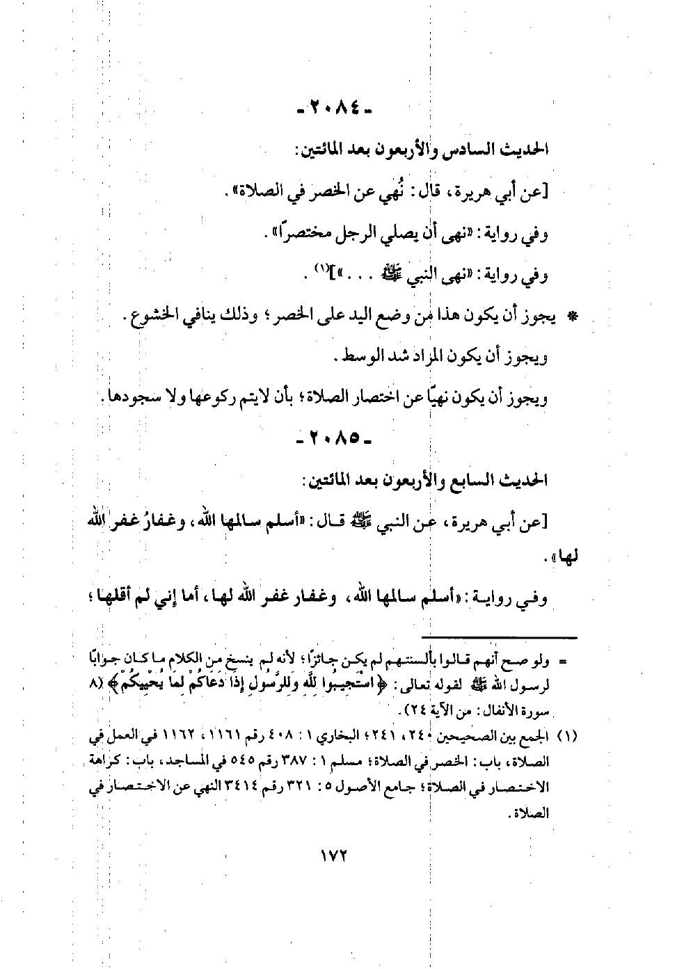 *هذا الحديث برواية ابن سيرين عن أبي هريرة: فالطريق الصحيحة عنه: أن ذو اليدين قال: يا رسول الله، أقصرت الصلاة أم نسيت؟ فقال: (كل ذلك لم يكن). فقال له الرجل: قد كن بعض ذلك. فهذه الرواية هي الصحيحة التي يشهد بعضها لبعض، وأما الرواية الأخرى التي رويت عن ابن سيرين، وفيها: (لم أنس ولم تقصر) فإن مثل هذا لا يجوز أن يجري على رسول الله - صلى الله عليه وسلم -؛ لأنه لا يجوز أن يقول لم أنس وقد نسي؛ لأن الراوي روى الحديث عن ابن سيرين بالمعنى على ظن صفة أن هذا المعنى معبر عن ذلك، ولم يكن عالمًا؛ فأتى بمعنى لا يصح.