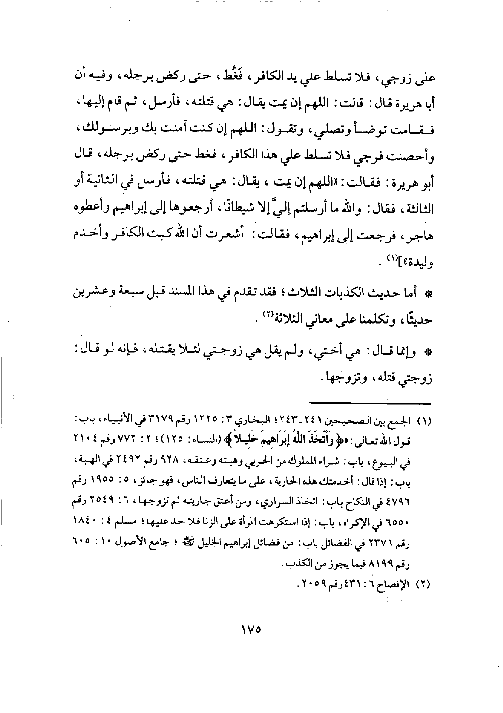 [عن أبي هريرة، أن رسول الله - صلى الله عليه وسلم - قال: (لم يكذب إبراهيم النبي عليه السلام قط إلا ثلاث كذبات، اثنتين في ذات الله؛ قوله: {إني سقيم}، وقوله: {بل فعله كبيرهم هذا}، وواحدة في شأن سارة؛ فإن قدم أرض جبار، ومعه سارة، وكانت أحسن الناس، فقال لها: إن هذا الجابر إن يعلم أنك امرأتي (50/ب) يغلبني عليك؛ فإن سألك فأخبريه أنك أختي؛ فإنك أختي في الإسلام، فإني لا أعلم في الأرض مسلمًا غيري وغيرك، فلما دخل أرضه رآها بعض أهل هذا الجبار، فأتاه، فقال: لقد قدم أرضك امرأة لا ينبغي لها أن تكون إلا لك، فأرسل إليها، فأتي بها، فقام إبراهيم إلى الصلاة، فلما دخلت عليه لم يتمالك أن بسط يده إليها، فقبضت يده قبضة شديدة، فقال لها: ادعي الله أن يطلق يدي ولا أضرك، ففعلت، فعاد، فقبضت أشد