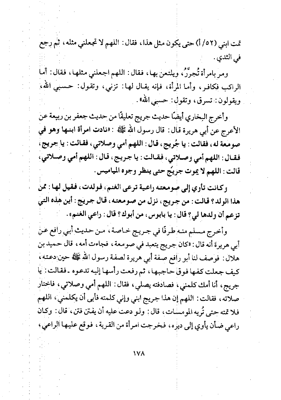 [عن أبي هريرة، عن النبي - صلى الله عليه وسلم - قال: (لم يتكلم في المهد لا ثلاثة: عيسى بن مريم، وصاحب جريج، وكان جريج رجلًا عابدًا، فاتخذ صومعة، فكان فيها، فأتته أمه وهو يصلي، فقالت: ياجريج، فقال: يا رب، أمي وصلاتي، فأقبل على صلاته، فانصرفت. فلما كان من الغد، أتته وهو يصلي، فقالت: ياجريج، فقال: يا رب، أمي وصلاتي، فاقبل على صلاته، فلما كان من الغد أتته وهو يصلي، فقالت: يا جريج فقال: أي رب، أمي وصلاتي، فأقبل على صلاته، فقالت: اللهم لا تمته حتى ينظر إلى وجوه المومسات،.