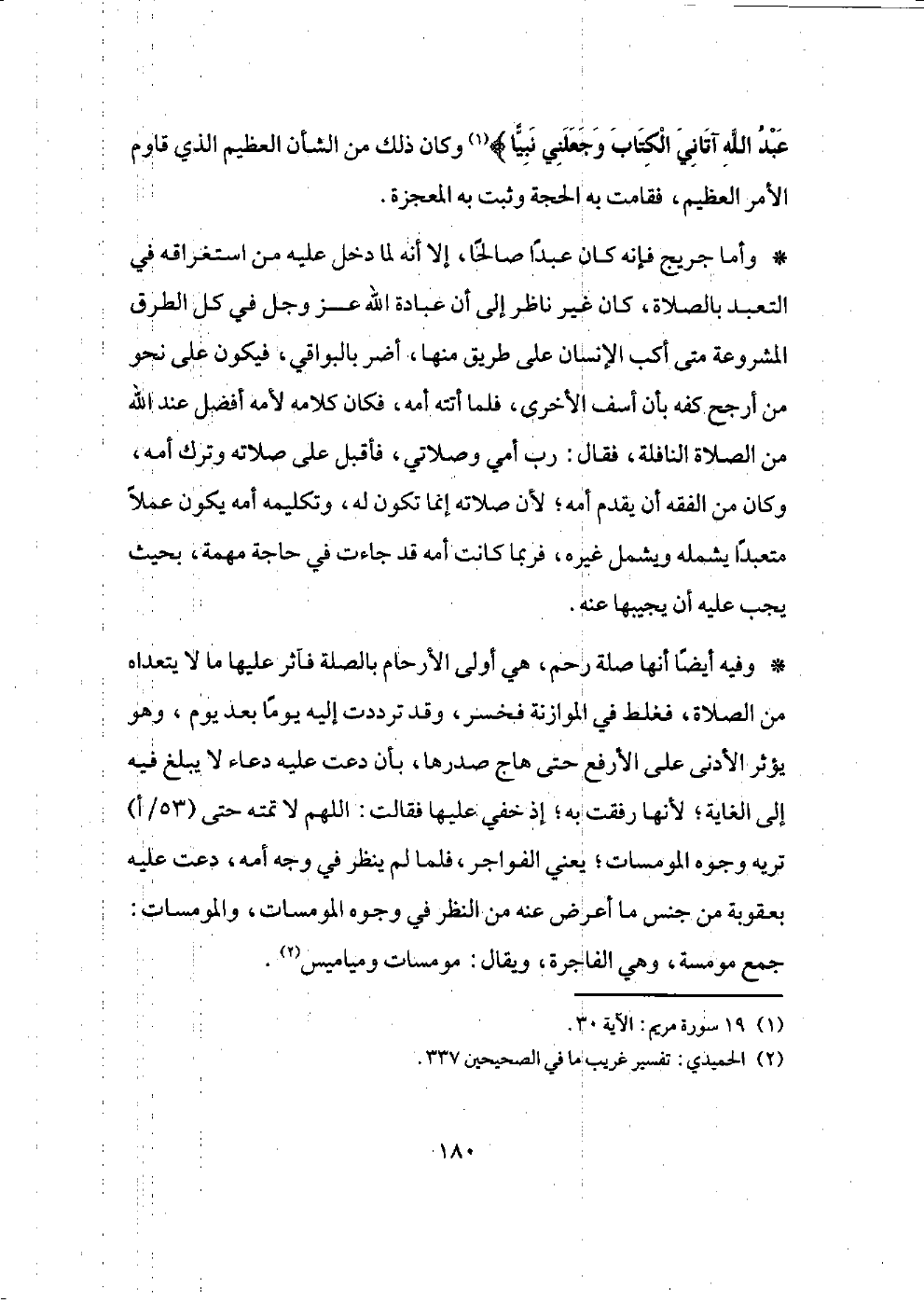 وأخرج مسلم منه طرفًا في جريج خاصة، من حديث أبي رافع عن أبي هريرة أنه قال: (كان جريج يتعبد في صومعة، فجاءت أمه، قال حميد بن هلال: فوصف لنا أبو رافع صفة أبي هريرة لصفة رسول الله - صلى الله عليه وسلم - حين دعته، كيف جعلت كفها فوق حاجبها، ثم رفعت رأسها إليه تدعوه- فقالت: يا جريج، أنا أمك كلمني، فصادفته يصلي، فقال: اللهم أمي وصلاتي، فاختار صلاته، فقالت: اللهم إن هذا جريج ابني وإني كلمته فأبي أن يكلمني، اللهم لا تمته حتى تريه المومسات، قال: ولو دعت عليه أن يفتن فتن، قال: وكان راعي ضأن يأوي إلى ديره، فخرجت امرأة من القرية، فوقع عليها الراعي،