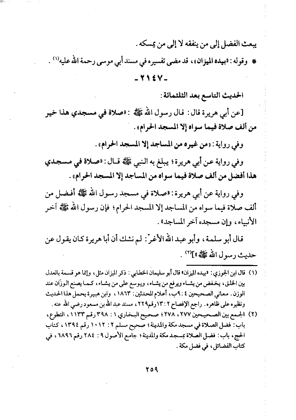 وفي رواية: (نحن الآخرون السابقون يوم القيامة، وقال: (يد الله ملأى لا يغيضها نفقة، سحاء الليل والنهار، وقال: أرأيتم ما أنفق منذ خلق السموات والأرض؟ فإنه لم يغض ما في يده، وكان عرشه على الماء، وبيده الميزان يخفض ويرفع).