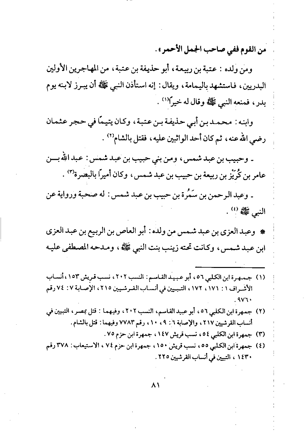 ومسعود بن علقمة بن المطلب بن عبد مناف، وعثمان بن علقمة، وعامر ابن علقمة، وقد انقرض ولد علقمة فلم يبق إلا آل أبي نبقة بن علقمة. وولد هاشم بن المطلب: عبد يزيد بن هاشم، وكان يقال لعبد يزيد (المحض)؛ لأن أمه: الشفاء بنت هاشم بن عبد مناف، وكان أول منافي ولدبه مناقبه.