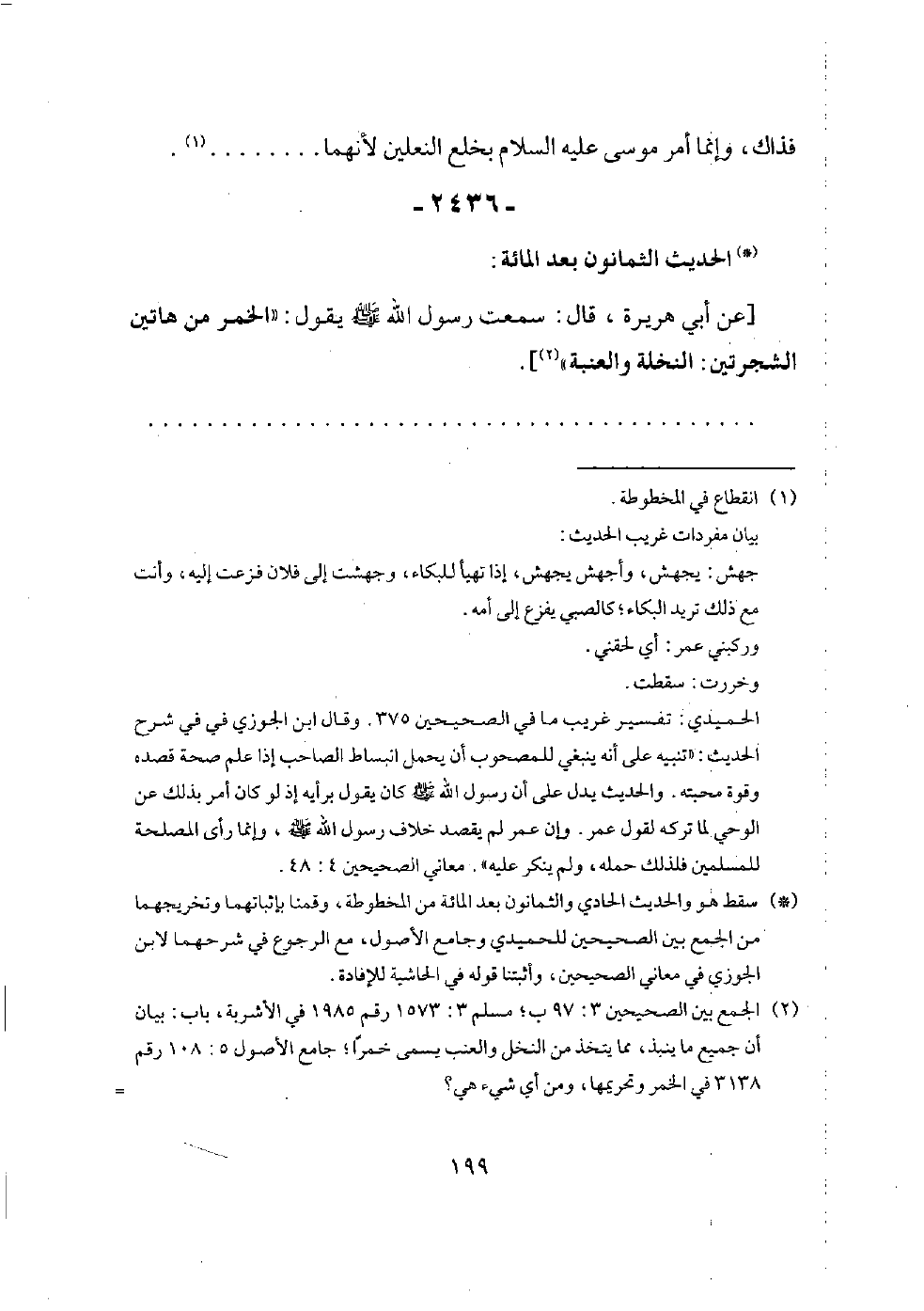 * فأما تخصيص ذلك بالنعل، فلا أرى ألا أنه - صلى الله عليه وسلم - قد كان في ذلك الانفراد مناجيا لله عز وجل، وقد كان موسى عند دنوه للمناجاة أمر بخلع نعليه، فإن كان أراد أن الجمع بين خلع النعلين وبين جعلهما علامة لم يذكره أبو هريرة عنه