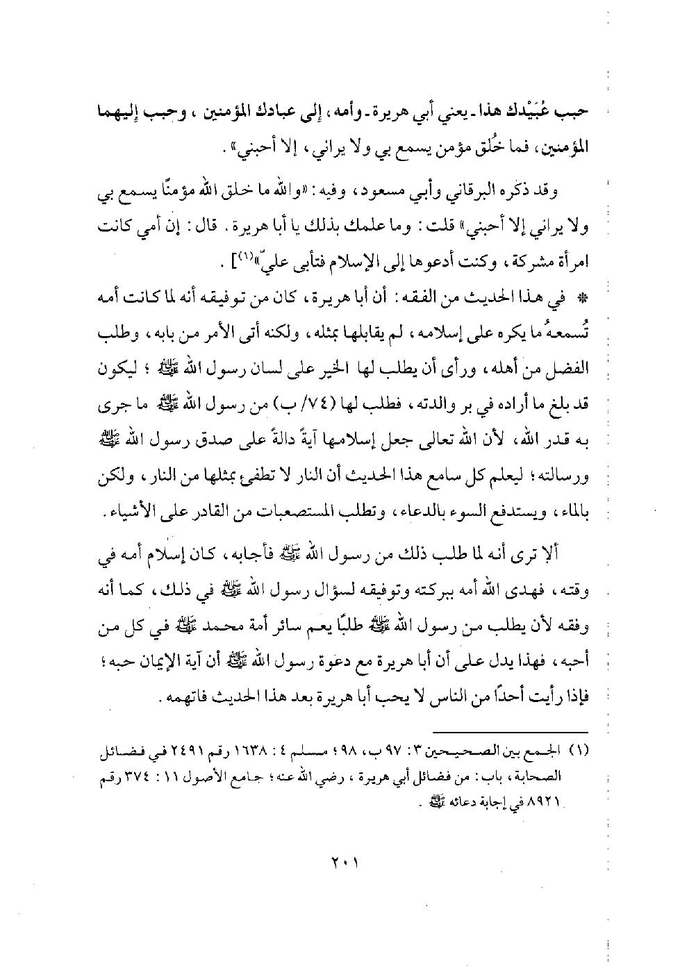 قال: فرجعت إلى رسول الله - صلى الله عليه وسلم - فأتيته وأنا أبكي من الفرح، قال: قلت: يا رسول الله أبشر فقد استجاب الله دعوتك، وهدى أم أبي هريرة، فحمد الله وقال: (خيرا). قال: قلت: يا رسول الله، ادع الله أن يحببني أنا وأمي إلى عباده المؤمنين، ويحببهم إلينا، قال: فقال رسول الله - صلى الله عليه وسلم -: (اللهم