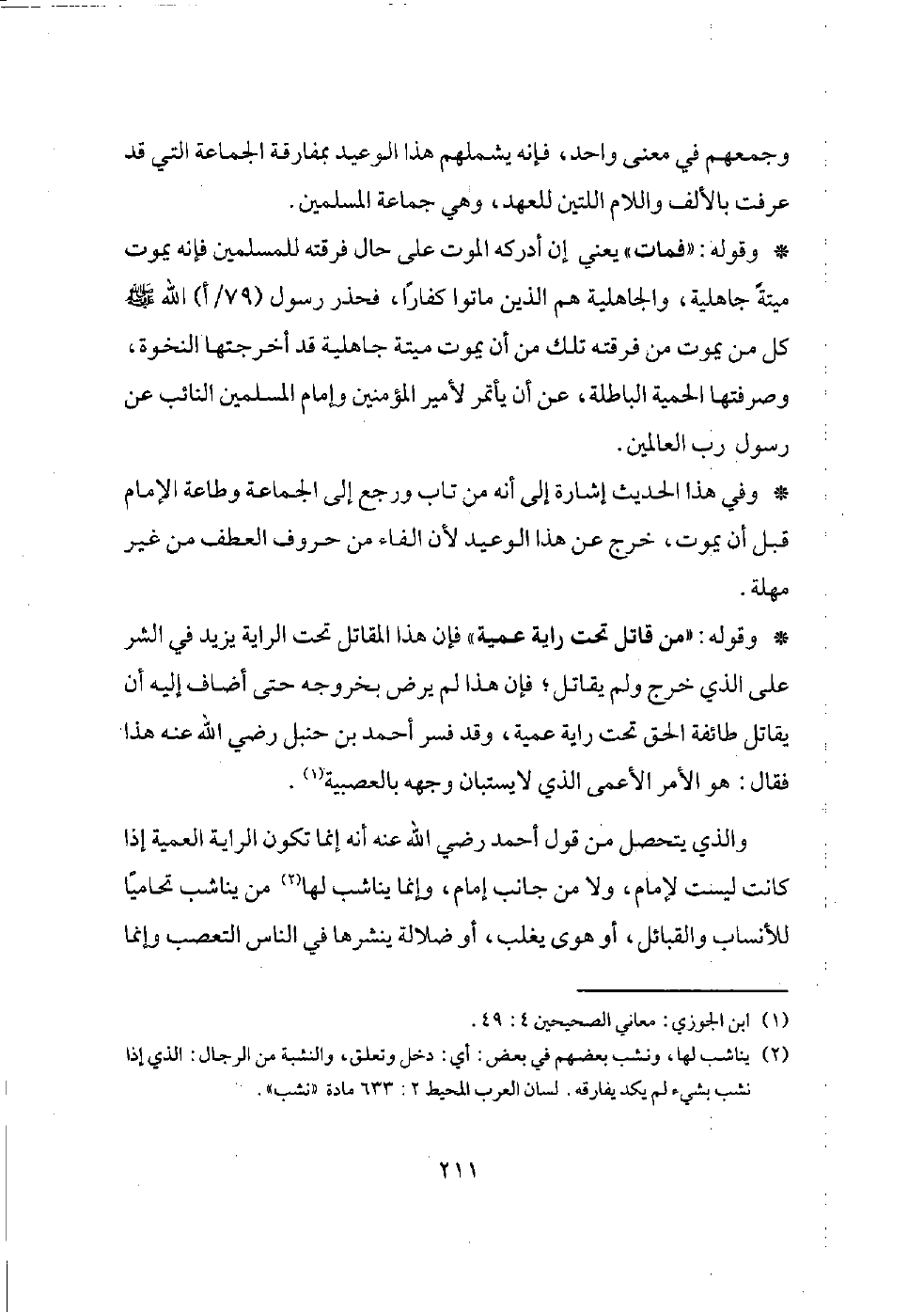 [عن أبي هريرة، عن النبي - صلى الله عليه وسلم - أنه قال: (من خرج من الطاعة، وفارق الجماعة، فمات، مات موتة جاهلية، ومن (78/ب) قاتل تحت راية عمية، يغضب لعصبية، أو يدعو إلى عصبية، أو ينصر عصبية، فقتل فقتله جاهلية، ومن خرج على أمتي، يضرب برها وفاجرها، ولا يتحاشى من مؤمنها، ولا يفي لدى عهده فليس مني ولست منه)].