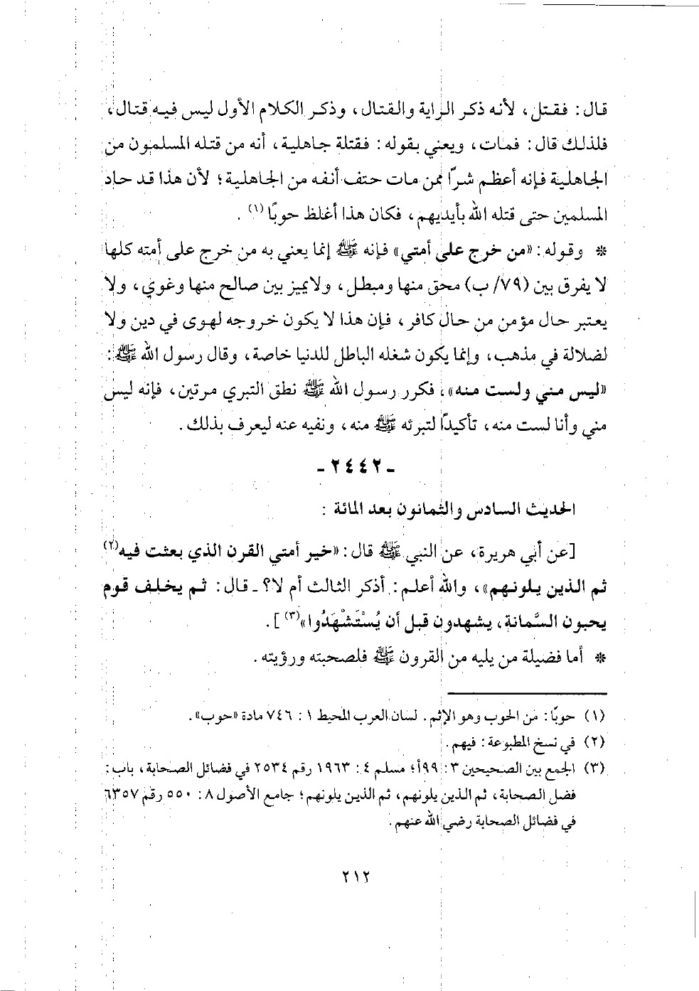 * وقوله: (من قاتل تحت راية عمية) فإن هذا المقاتل تحت الراية يزيد في الشر على الذي خرج ولم يقاتل؛ فإن هذا لم يرض بخروجه حتى أضاف إليه أن يقاتل طائفة الحق تحت راية عمية، وقد فسر أحمد بن حنبل رضي الله عنه هذا فقال، هو الأمر الأعمى الذي لا يستبان وجهه بالعصبية.