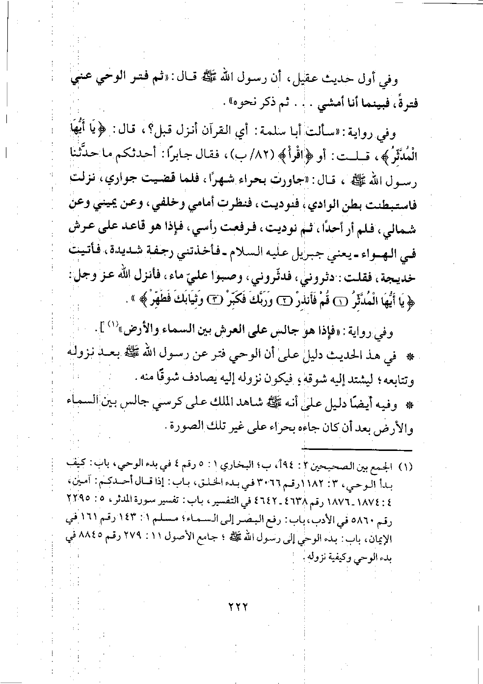 [عن جابر، قال: سمعت رسول الله - صلى الله عليه وسلم - وهو يحدث عن فترة الوحي، فقال في حديثه: (فبينا أنا أمشي، سمعت صوتا من السماء، فرفعت رأسي، فإذا الملك الذي جاءني بحراء جالس على كرسي بين السماء والأرض، فجثثت منه رعبا، فرجعت فقلت: زملوني زملوني، فدثروني، فأنزل الله عز وجل: {يا أيها المدثر (1) قم فأنذر (2) وربك فكبر (3) وثيابك فطهر (4) والرجز فاهجر} قبل أن تفرض الصلاة، وهي الأوثان).