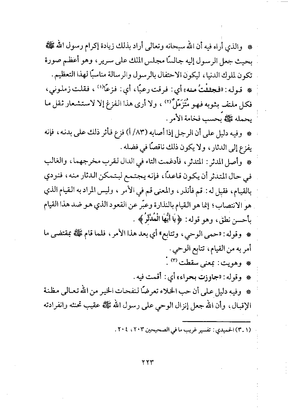 وفي رواية: (سألت أبا سلمة: أي القرآن أنزل قبل؟، قال: {يا أيها المدثر}، قلت: أو {اقرأ} (82/ب)، فقال جابرا: أحدثكم ما حدثنا رسول الله - صلى الله عليه وسلم -، قال: (جاورت بحراء شهرا، فلما قضيت جواري، نزلت فاستبطنت بطن الوادي، فنوديت، فنظرت أمامي وخلفي، وعن يميني وعن شمالي، فلم أر أحدا، ثم نوديت، فرفعت رأسي، فإذا هو قاعد على عرش في الهواء - يعني جبريل عليه السلام - فأخذتني رجفة شديدة، فأتيت خديجة، فقلت: دثروني، فدثروني، وصبوا علي ماء، فأنزل الله عز وجل: {يا أيها المدثر (1) قم فأنذر (2) وربك فكبر (3) وثيابك فطهر}).