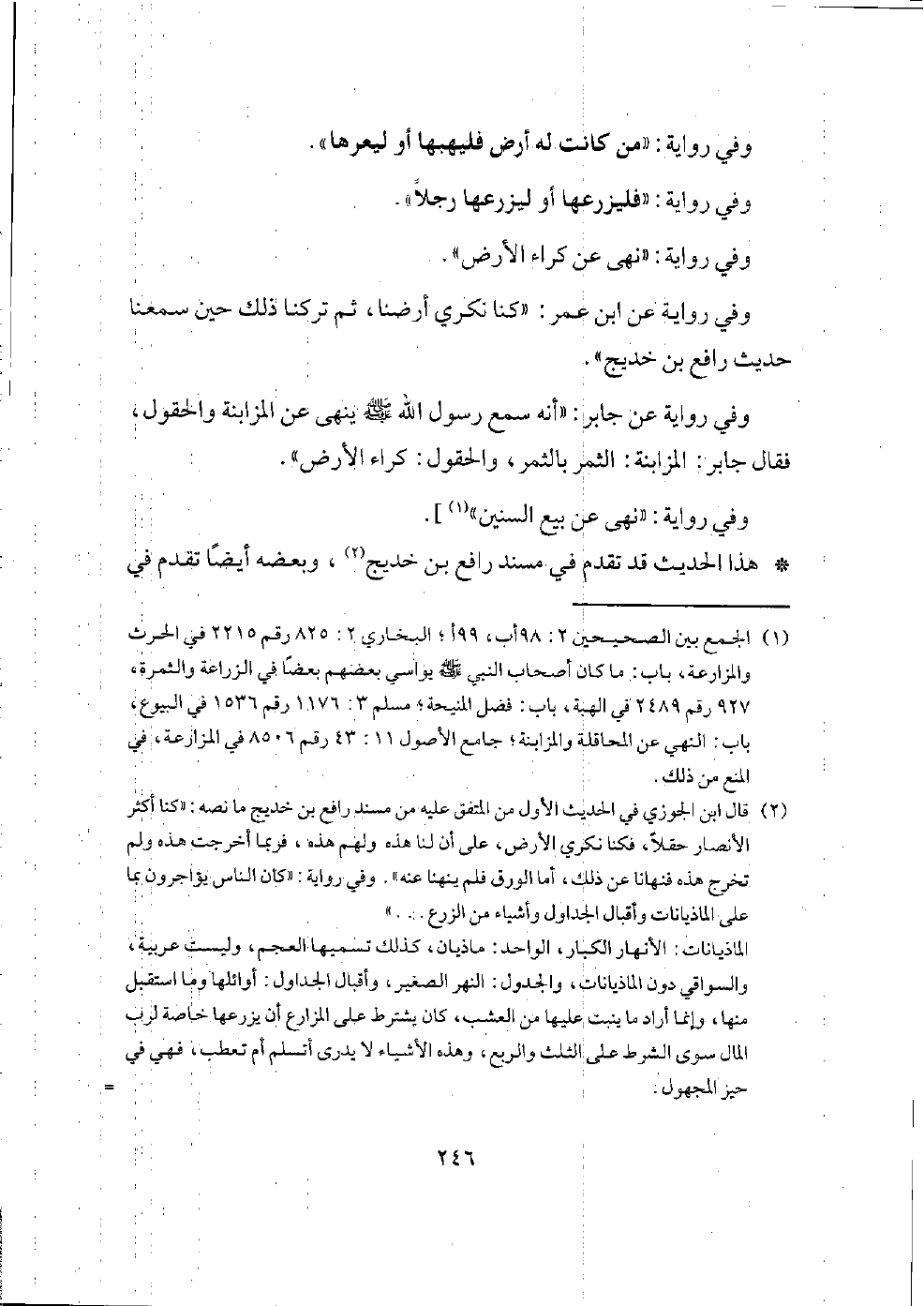 وفي رواية: (كنا نخابر على عهد رسول الله - صلى الله عليه وسلم - فنصيب من القصرى، ومن كذا، فقال رسول الله - صلى الله عليه وسلم -: (من كانت له أرض فليزرعها أو فليحرثها أخاه وإلا فليدعها).