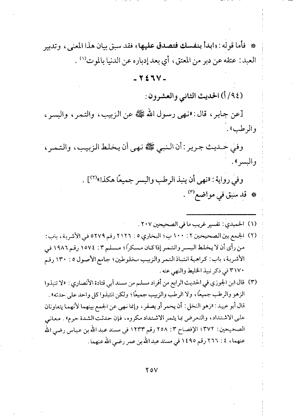 وفي رواية لمسلم: (أعتق رجلا من بني عذرة عبدا له عن دبر، فبلغ ذلك رسول الله - صلى الله عليه وسلم -، فقال: (ألك مال غيره؟) قال: لا، قال: من يشتريه مني؟ فاشتراه نعيم بن عبد الله العدوي، بثمانمائة درهم، فجاء بها إلى رسول الله - صلى الله عليه وسلم - فدفعها إليه، ثم قال: (ابدأ بنفسك فتصدق عليها؛ فإن فضل شيء فلأهلك، فإن فضل عن أهلك شيء فللذي قرابتك، فإن فضل عن ذي قرابتك فهكذا وكذا، يقول: فبين يديك، وعن يمينك، وعن شمالك).