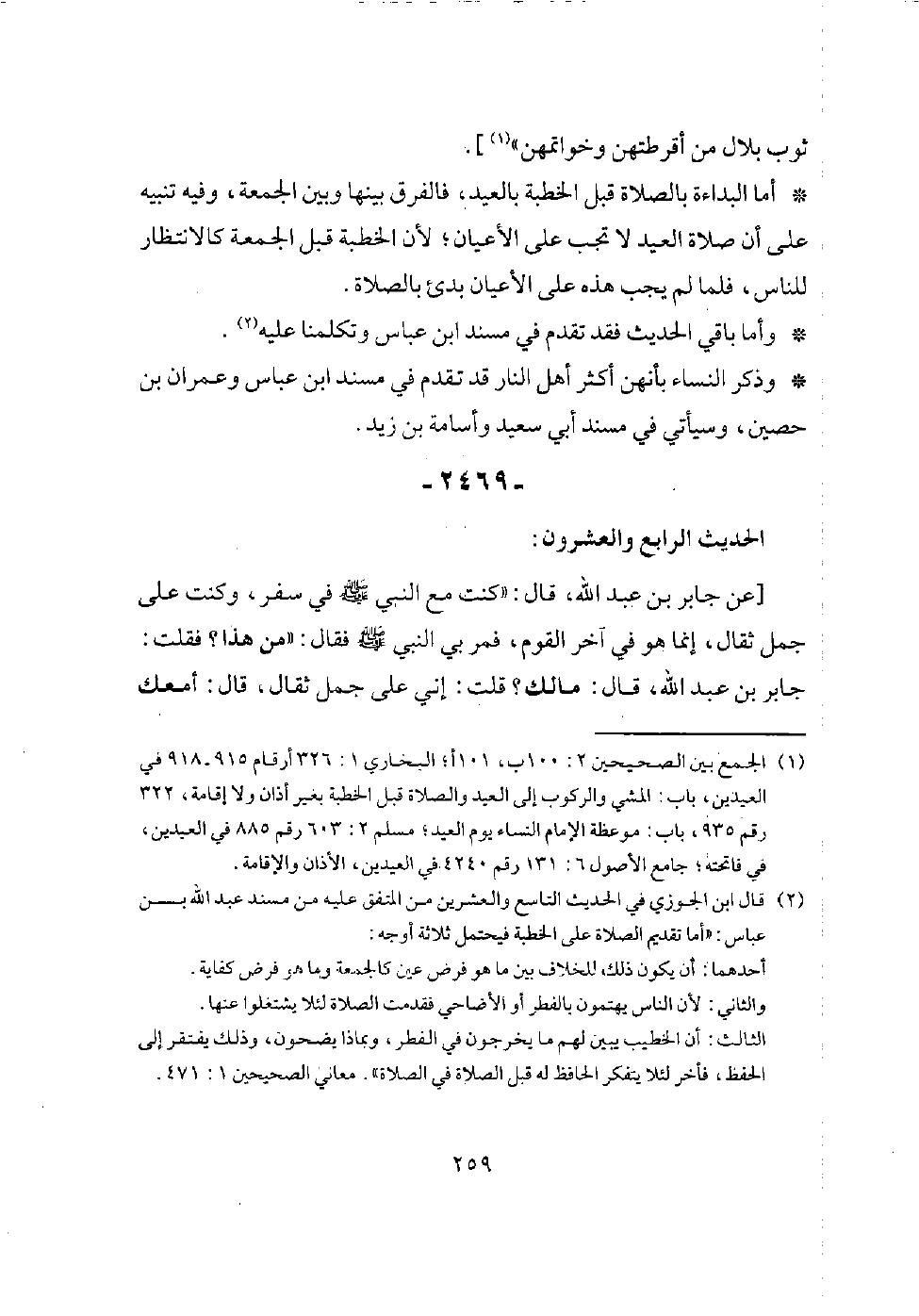 وفي رواية: (شهدت مع النبي - صلى الله عليه وسلم - يوم العيد، فبدأ بالصلاة قبل الخطبة بلا أذان ولا إقامة، ثم قام متوكئا على بلال، فأمر بتقوى الله، وحث على طاعته، ووعظ الناس (94/ب) وذكرهم، ثم مضى حتى أتى النساء، فوعظهن وذكرهن، وقال: تصدقن، فإن أكثركن حطب جهنم، فقامت امرأة من سطة النساء سفعاء الخدين، فقالك: لم يا رسول الله؟ قال: لأنكن تكثرن الشكاية، وتكفرن العشير، فقال: فجعلن يتصدقن من حليهن، يلقين في
