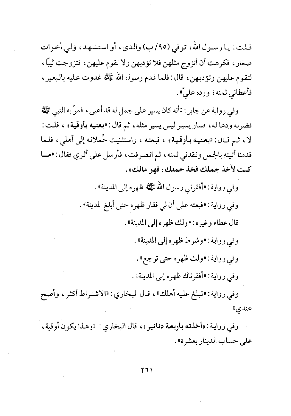 وفي رواية: (أنه قال له: قد أخذت جملك بأربعة دنانير، ولك ظهره إلى المدينة).