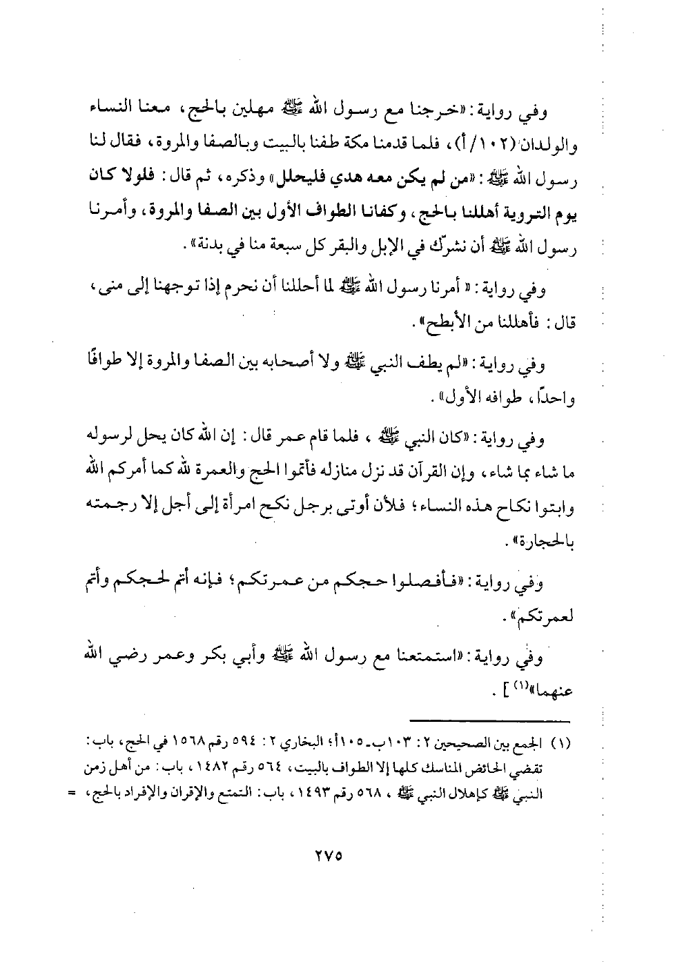 وفي رواية عن جابر: (أقبلنا مهلين (101/ب) مع رسول الله - صلى الله عليه وسلم - بحج مفردا وأقبلت عائشة بعمرة، حتى إذا كنا بسرف عركت، حتى إذا قدمنا طفنا بالكعبة والصفا والمروة، فأمرنا رسول الله - صلى الله عليه وسلم - أن يحل منا من لم يكن معه هدي، قال: فقلنا: حل ماذا؟ قال: الحل كله، فواقعنا النساء، وتطيبنا بالطيب، ولبسنا ثيابا وليس بيننا وبين عرفة إلا أربع ليال.