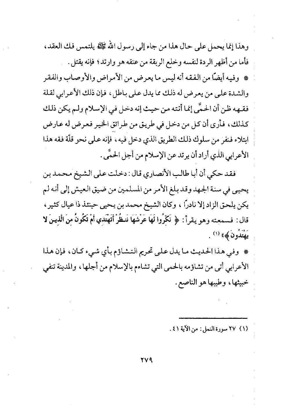 * وفيه أيضا من الفقه أنه لا يحل أن يفك عن مثله ربقة الحق في ظاهره ما بقي في هذه الدنيا، وإن كانت أمارات نطقه دالة على أنه قد ارتد من جهة أنه أتى رسول الله - صلى الله عليه وسلم - يستقيله البيعة من أجل أنه حم ليعود إلى الكفر، فلم يقله رسول الله - صلى الله عليه وسلم -، مع أنه لم يقله في حالته تلك بهذه الردة؛ بل ترك ظاهره في قيد الحق شرعا ليفي إن فاء (103/ب)، وإلا فالنار من ورائه في الآخرة،