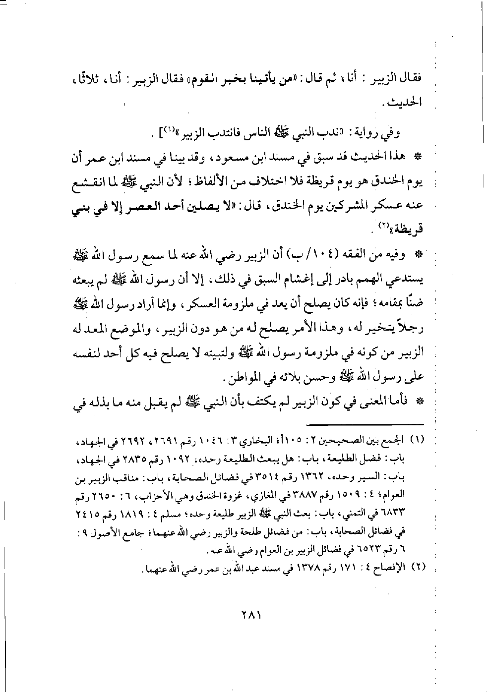 [عن جابر، قال: (ندب رسول الله - صلى الله عليه وسلم - الناس يوم الخندق، فانتدب الزبير، ثم ندبهم فانتدب الزبير، ثم ندبهم فانتدب الزبير، فقال النبي - صلى الله عليه وسلم -: إن لكل نبي حواري وحواري الزبير)، قال سفيان: الحواري: الناصر.