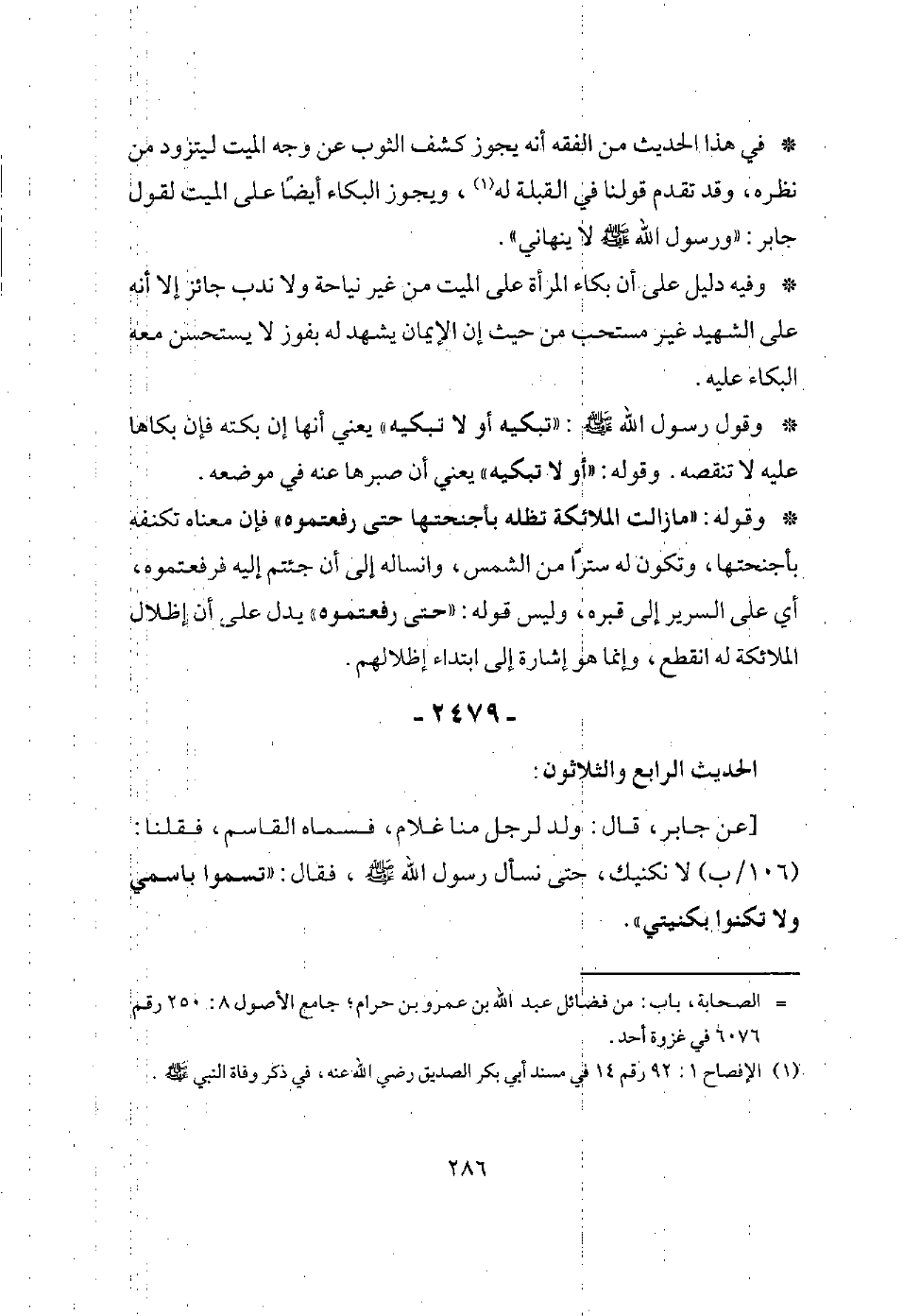 [عن جابر، قال: (أصيب أبي يوم أحد، فجعلت أكشف الثوب (106/أ) عن وجهه وأبكي، وجعلوا ينهونني، ورسول الله - صلى الله عليه وسلم - لا ينهاني، وجعلت فاطمة بنت عمرو تبكيه، فقال رسول الله - صلى الله عليه وسلم -: (تبكيه أو لا تبكيه، ما زالت الملائكة تظله بأجنحتها حتى رفعتموه).