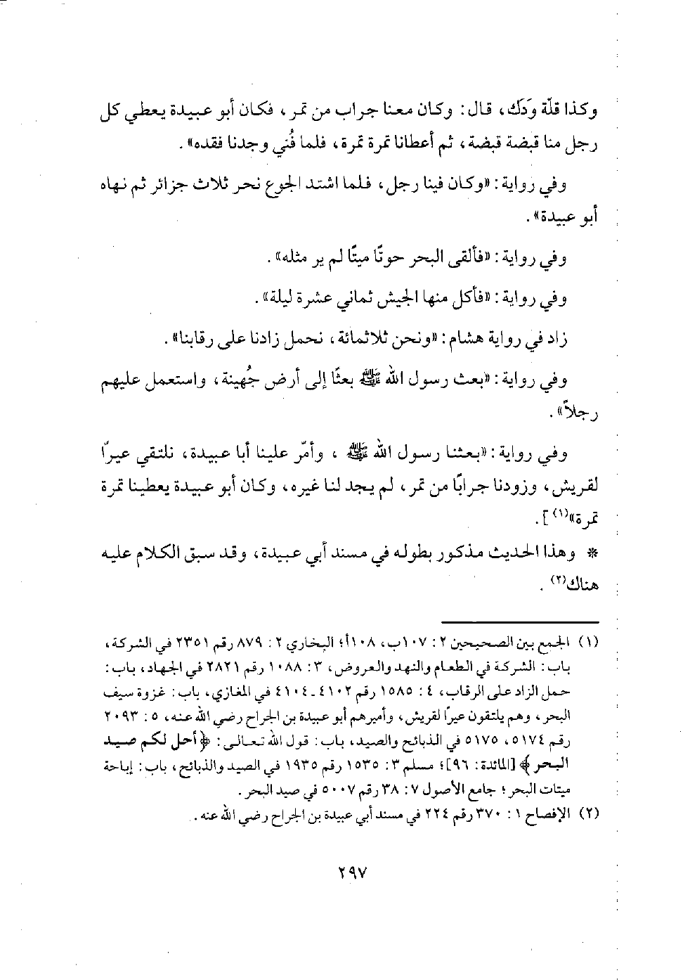 [عن جابر بن عبد الله، قال: (بعثنا رسول الله - صلى الله عليه وسلم -، ونحن ثلاثمائة راكب، وأميرنا أبو عبيدة بن الجراح نرصد عيرا لقريش، فأقمنا بالساحل نصف شهر، فأصابنا جوع شديد، حتى أكلنا الخبط، فسمي جيش الخبط، فألقى لنا البحر دابة، يقال لها: العنبر، فأكلنا منها نصف شهر (110/أ) وأدهنا من ودكها، حتى ثاب أجسامنا، قال: فأخذ أبو عبيدة ضلعا من أضلاعه فنصبه، ثم نظر إلى أطول رجل في الجيش وأطول جمل، فحمله عليه فمر تحته، قال: وجلس في حجاج عينه نفر، قال: وأخرجنا من عينه كذا