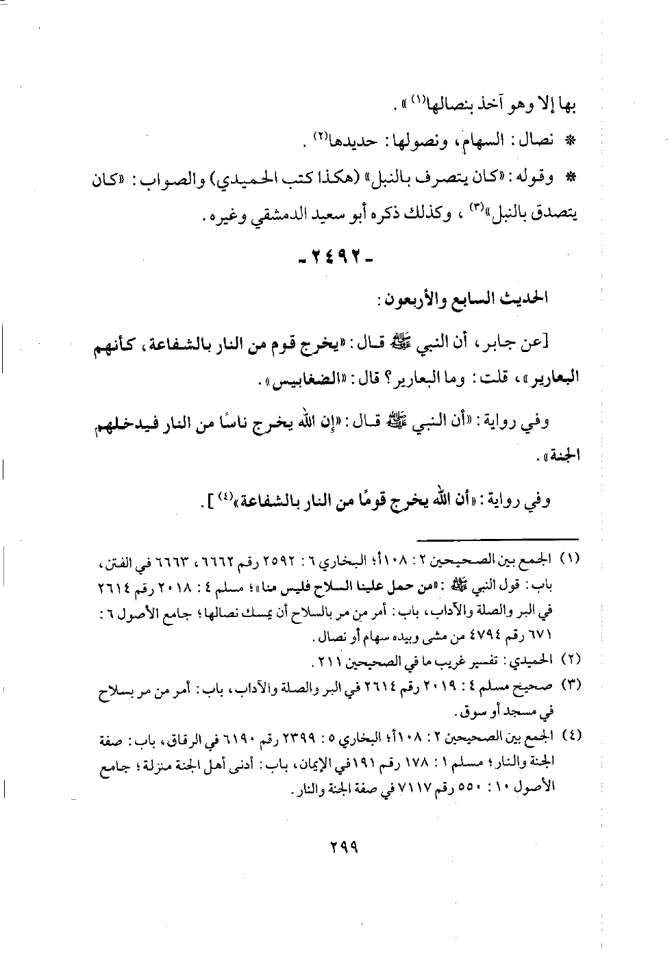 وفي رواية: (مر رجل بسهام في المسجد قد بدا نصولها فأمر أن يأخذ بنصولها لا يخدش مسلما).