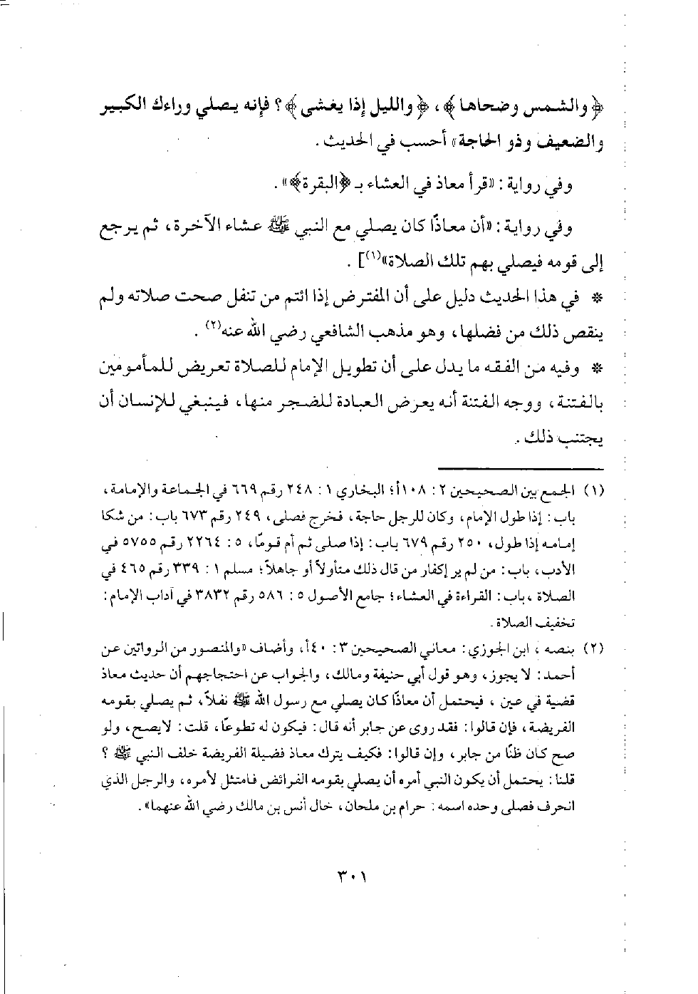 [عن جابر، قال: (كان معاذ يصلي مع النبي - صلى الله عليه وسلم - العشاء، ثم يأتي فيؤم قومه، فصلى ليلة مع النبي - صلى الله عليه وسلم - العشاء، ثم أتى قومه فأمهم، فافتتح بـ: {سورة البقرة}، فانحرف رجل مسلم ثم صلى وحده وانصرف، فقالوا: إنما نافقت يا فلان، قال: لا والله، ولآتين رسول الله - صلى الله عليه وسلم - فأخبرنه (111/أ)، فأتى رسول الله - صلى الله عليه وسلم - فقال: يا رسول الله إنا أصحاب نواضح نعمل بالنهار، وأن معاذا صلى معك العشاء ثم أتى فافتتح بـ {سورة البقرة}، فأقبل رسول الله - صلى الله عليه وسلم - على معاذ، فقال: يا معاذ أفتان أنت؟ اقرأ بكذا، أو اقرأ بكذا).