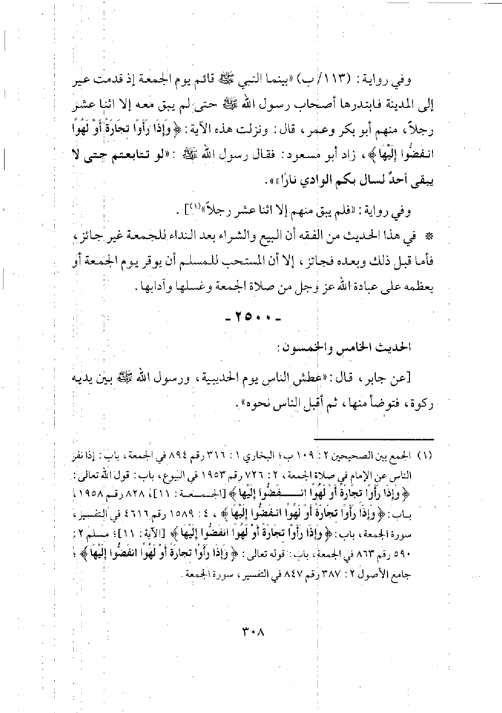 [عن جابر، قال: (بينما نحن نصلي مع النبي - صلى الله عليه وسلم - إذ أقبلت عير تحمل طعاما، فالتفتوا إليها، حتى ما بقي مع النبي - صلى الله عليه وسلم - إلا اثنا عشر رجلا، فنزلت هذه الآية: {وإذا رأوا تجارة أو لهوا انفضوا إليها وتركوك قائما}.