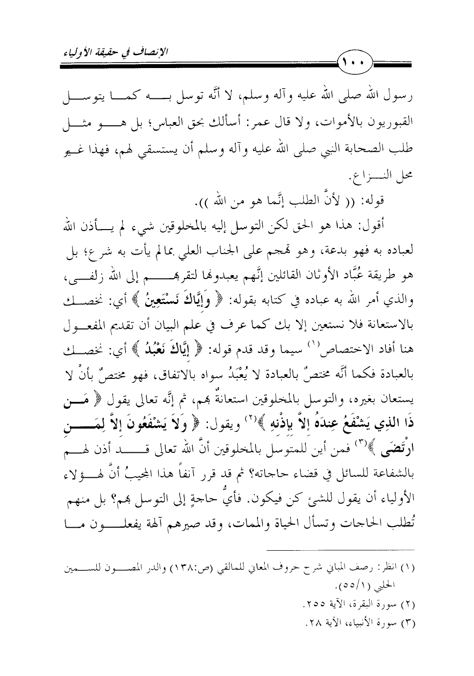 أقول: هذا هو الحق لكن التوسل إليه بالمخلوقين شيء لم يأذن الله لعباده به فهو بدعة، وهو تهجم على الجناب العلي بمالم يأت به شرع؛ بل هو طريقة عُبَّاد الأوثان القائلين إنَّهم يعبدونها لتقربهم إلى الله زلفى، والذي أمر الله به عباده في كتابه بقوله: {وَإِيَّاكَ نَسْتَعِينُ} أي: نخصك بالاستعانة فلا نستعين إلا بك كما عرف في علم البيان أن تقديم المفعول هنا أفاد الاختصاص1 سيما وقد قدم قوله: {إِيَّاكَ نَعْبُدُ} أي: نخصك بالعبادة فكما أنَّه مختصٌ بالعبادة لا يُعْبَدُ سواه بالاتفاق، فهو مختصٌ بأنْ لا يستعان بغيره، والتوسل بالمخلوقين استعانةٌ بهم، ثم إنَّه تعالى يقول {مَن ذَا الذِي يَشْفَعُ عِندَهُ إِلاَّ بِإِذْنِهِ} 2 ويقول: {وَلاَ يَشْفَعُونَ إِلاَّ لِمَنِ ارْتَضَى} 3 فمن أين للمتوسل بالمخلوقين أنَّ الله تعالى قد أذن لهم بالشفاعة للسائل في قضاء حاجاته؟ ثم قد قرر آنفاً هذا المجيبُ أنَّ لهؤلاء الأولياء أن يقول للشيء كن فيكون. فأيُّ حاجةٍ إلى التوسل بهم؟ بل منهم تُطلب الحاجات وتسأل الحياة والممات، وقد صيرهم آلهة يفعلون ما