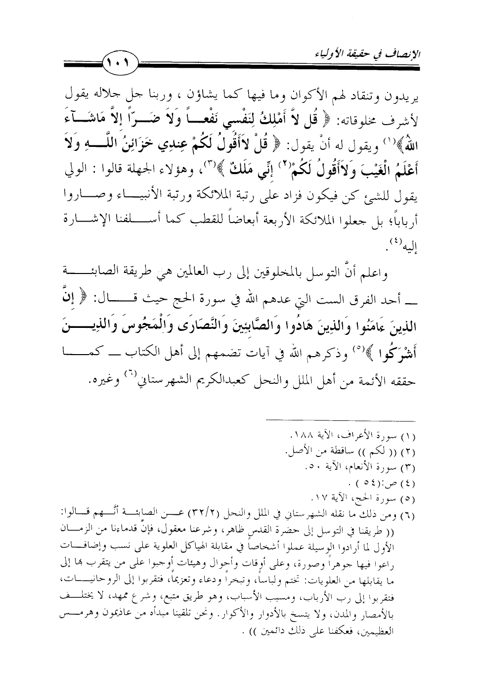 يريدون وتنقاد لهم الأكوان وما فيها كما يشاؤن، وربنا جل جلاله يقول لأشرف مخلوقاته: {قُل لاَّ أَمْلِكُ لِنَفْسِي نَفْعاً وَلاَ ضَرّاً إِلاَّ مَاشَآءَ اللهُ} 1 ويقول له أنْ يقول: {قُلْ لاَأَقُولُ لَكُمْ عِندِي خَزَائِنُ الله وَلاَ أَعْلَمُ الْغَيْبَ وَلاَأَقُولُ لَكُمْ 2 إِنِّي مَلَكٌ} 3، وهؤلاء الجهلة قالوا: الولي يقول للشيء كن فيكون فزاد على رتبة الملائكة ورتبة الأنبياء وصاروا أرباباً؛ بل جعلوا الملائكة الأربعة أبعاضاً للقطب كما أسلفنا الإشارة إليه4.