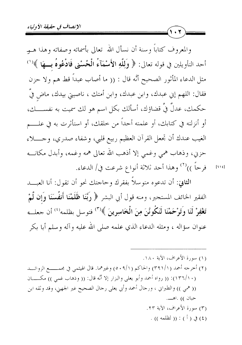 الثاني: أن تدعوه متوسلاً بفقرك وحاجتك نحو أن تقول: أنا العبد الفقير الخائف المستجير، ومنه قول أبي البشر {رَبَّنَا ظَلَمْنَا أَنفُسَنَا وَإِن لَّمْ تَغْفِرْ لَنَا وَتَرْحَمْنَا لَنَكُونَّنَ مِنَ الْخَاسِرينَ} 3 فتوسل بظلمه4 أن جعله عنوان سؤاله، ومثله الدعاء الذي علمه صلى الله عليه وآله وسلم أبا بكر
