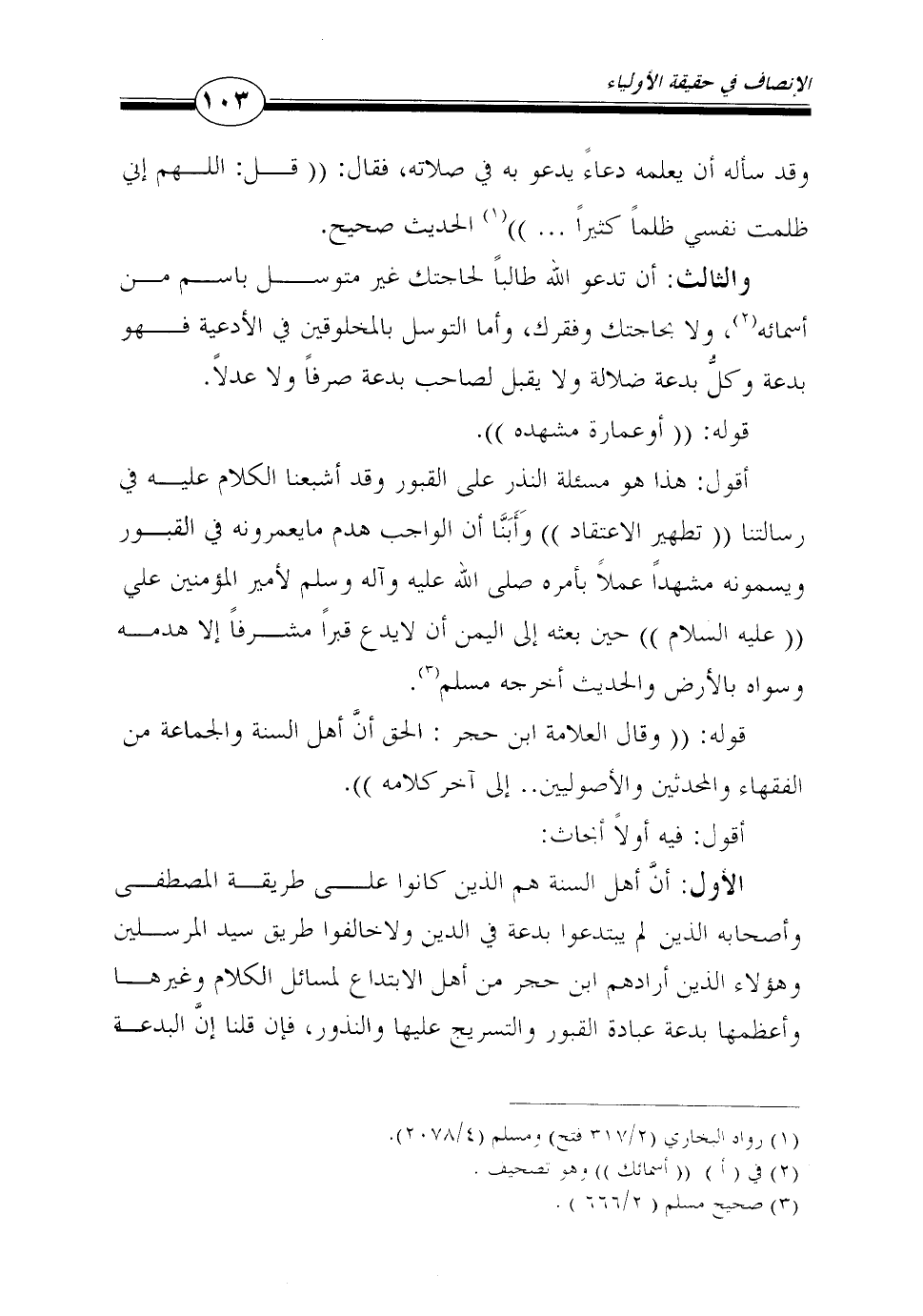 الأول: أنَّ أهل السنة هم الذين كانوا على طريقة المصطفى وأصحابه الذين لم يبتدعوا بدعة في الدين ولا خالفوا طريق سيد المرسلين وهؤلاء الذين أرادهم ابن حجر من أهل الابتداع لمسائل الكلام وغيرها وأعظمها بدعة عبادة القبور والتسريج عليها والنذور، فإن قلنا إنَّ البدعة