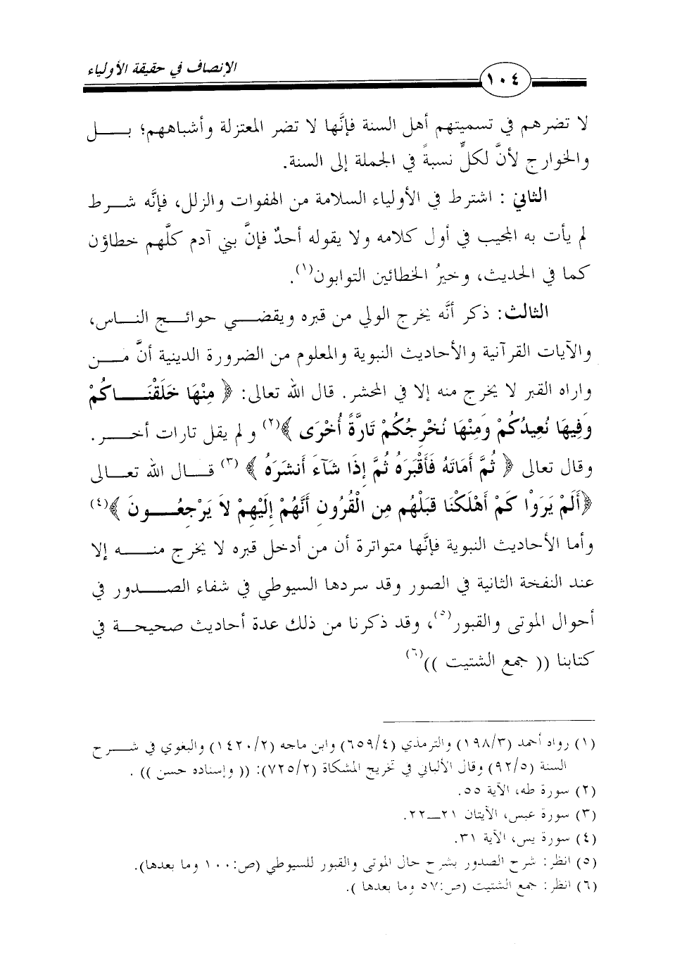 الثالث: ذكر أنَّه يخرج الولي من قبره ويقضي حوائج الناس، والآيات القرآنية والأحاديث النبوية والمعلوم من الضرورة الدينية أنَّ من واراه القبر لا يخرج منه إلا في المحشر. قال الله تعالى: {مِنْهَا خَلَقْنَاكُمْ وَفِيهَا نُعِيدُكُمْ وَمِنْهَا نُخْرِجُكُمْ تَارَّةً أُخْرَى} 2 ولم يقل تارات أخر. وقال تعالى {ثُمَّ أَمَاتَهُ فَأَقْبَرَهُ ثُمَّ إِذَا شَآءَ أَنشَرَهُ} 3 قال الله تعالى {أَلَمْ يَرَوْا كَمْ أَهْلَكْنَا قبَلْهُم مِن الْقُرُونِ أَنَّهُمْ إِلَيْهِمْ لاَ يَرْجِعُونَ} 4 وأما الأحاديث النبوية فإنَّها متواترة أن من أدخل قبره لا يخرج منه إلا عند النفخة الثانية في الصور وقد سردها السيوطي في شفاء الصدور في أحوال الموتى والقبور5، وقد ذكرنا من ذلك عدة أحاديث صحيحة في كتابنا "جمع الشتيت"6