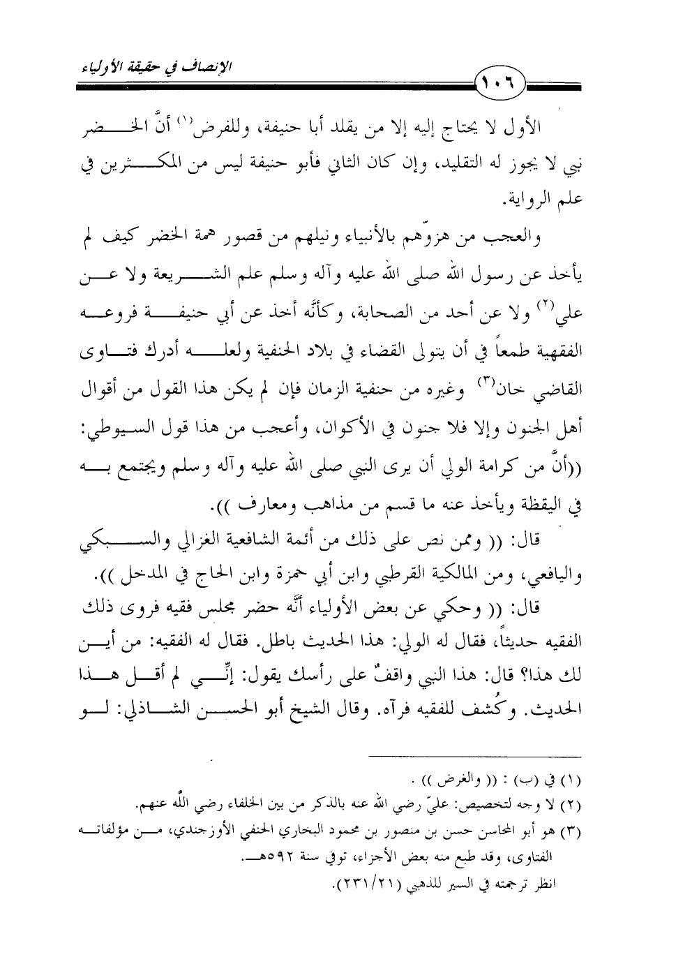والعجب من هزوّهم بالأنبياء ونيلهم من قصور همة الخضر كيف لم يأخذ عن رسول الله صلى الله عليه وآله وسلم علم الشريعة ولا عن علي2 ولا عن أحد من الصحابة، وكأنَّه أخذ عن أبي حنيفة فروعه الفقهية طمعاً في أن يتولى القضاء في بلاد الحنفية ولعله أدرك فتاوى القاضي خان3 وغيره من حنفية الزمان فإن لم يكن هذا القول من أقوال أهل الجنون وإلا فلا جنون في الأكوان، وأعجب من هذا قول السيوطي: "أنَّ من كرامة الولي أن يرى النبي صلى الله عليه وآله وسلم ويجتمع به في اليقظة ويأخذ عنه ما قسم من مذاهب ومعارف".