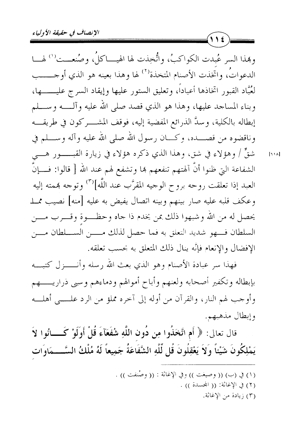 وبهذا السر عُبِدت الكواكبُ، واتُّخِذت لها الهياكلُ، وصُنعت1 لها الدعواتُ، واتخذت الأصنام المتخذة2 لها وهذا بعينه هو الذي أوجب لعُبَّاد القبور اتخاذها أعياداً، وتعليق الستور عليها وإيقاد السرج عليها، وبناء المساجد عليها، وهذا هو الذي قصد صلى الله عليه وآله وسلم إبطاله بالكلية، وسدَّ الذرائع المفضية إليه، فوقف المشركون في طريقه وناقضوه من قصده، وكان رسول الله صلى الله عليه وآله وسلم في شقٍّ [618] وهؤلاء في شق، وهذا الذي ذكره هؤلاء في زيارة القبور هي الشفاعة التي ظنوا أنَّ آلهتهم تنفعهم بها وتشفع لهم عند الله [قالوا: فإنَّ العبد إذا تعلقت روحه بروح الوجيه المقرَّب عند الله] 3 وتوجه بهمته إليه وعكف قلبه عليه صار بينهم وبينه اتصال يفيض به عليه [منه] نصيب مما يحصل له من الله وشبهوا ذلك بمن يخدم ذا جاه وحظوةٍ وقرب من السلطان فهو شديد التعلق به فما حصل لذلك من السلطان من الإفضال والإنعام فإنَّه ينال ذلك المتعلق به بحسب تعلقه.