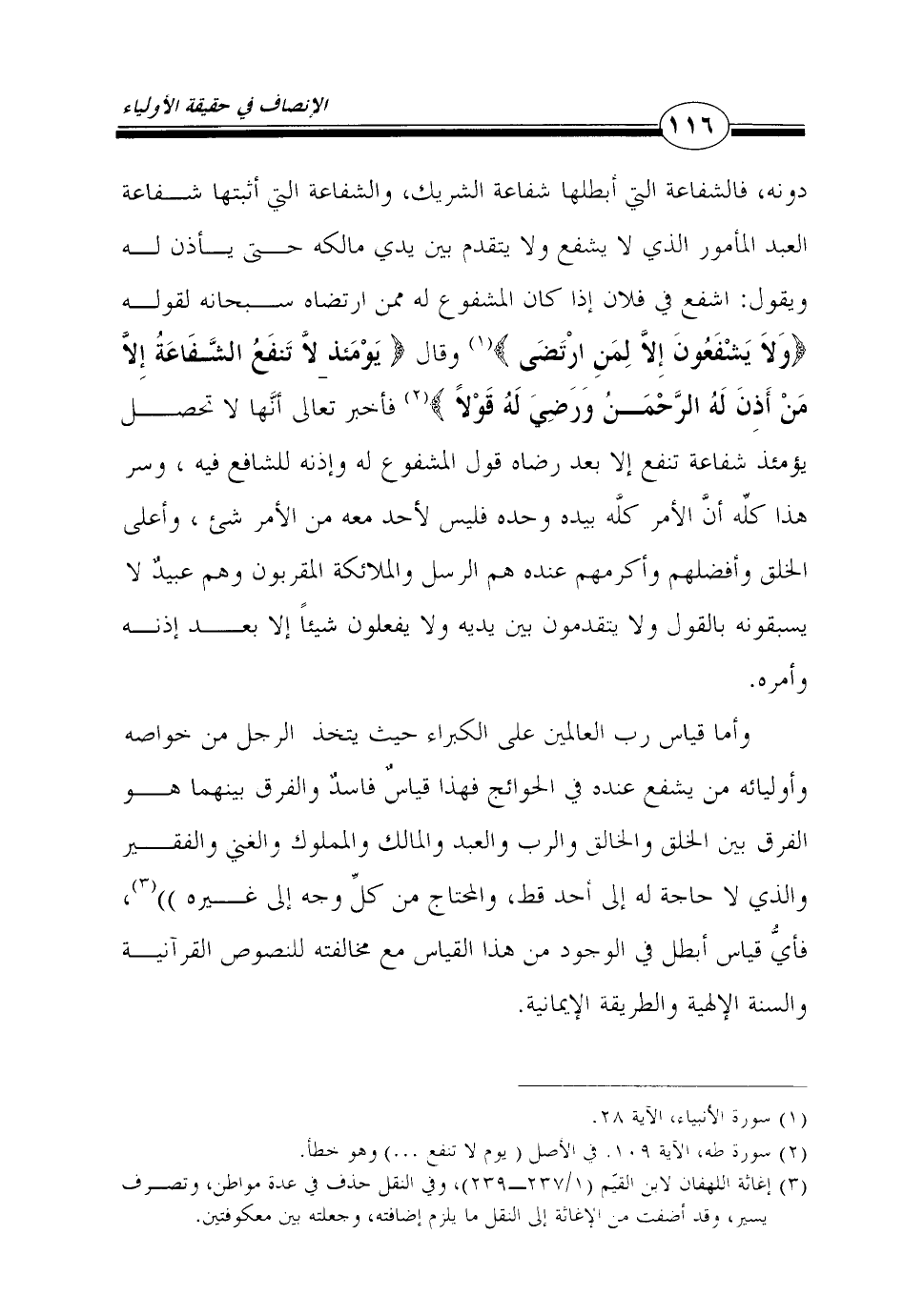 وأما قياس رب العالمين على الكبراء حيث يتخذ الرجل من خواصه وأوليائه من يشفع عنده في الحوائج فهذا قياسٌ فاسدٌ والفرق بينهما هو الفرق بين الخلق والخالق والرب والعبد والمالك والمملوك والغني والفقير والذي لا حاجة له إلى أحد قط، والمحتاج من كلِّ وجه إلى غيره"3، فأيُّ قياس أبطل في الوجود من هذا القياس مع مخالفته للنصوص القرآنية والسنة الإلهية والطريقة الإيمانية.