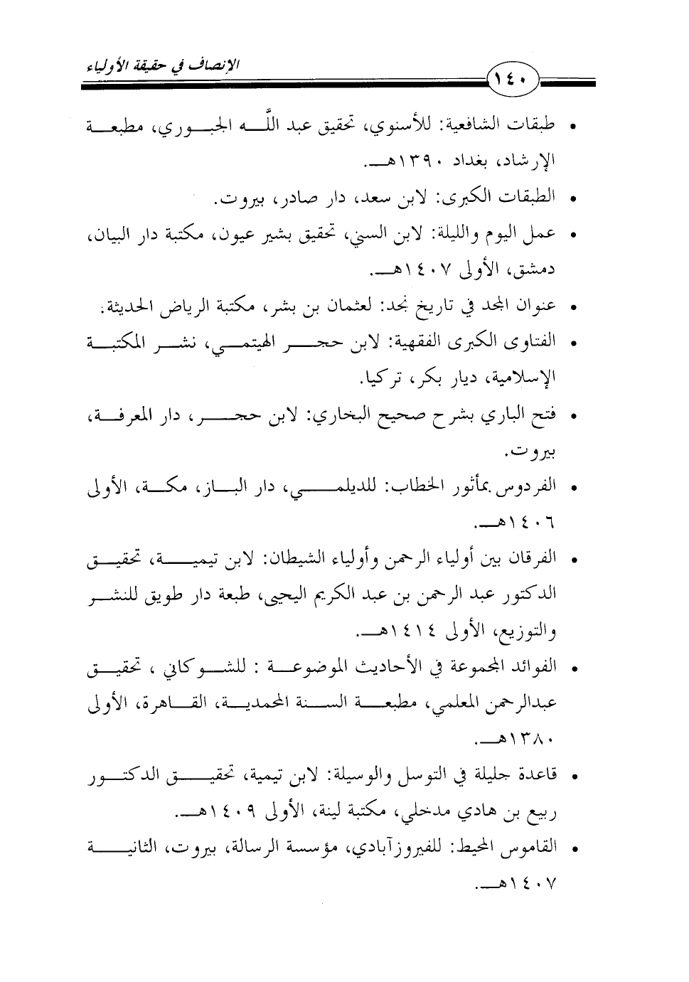 الفرقان بين أولياء الرحمن وأولياء الشيطان: لابن تيمية، تحقيق الدكتور عبد الرحمن بن عبد الكريم اليحيى، طبعة دار طويق للنشر والتوزيع، الأولى 1414?.