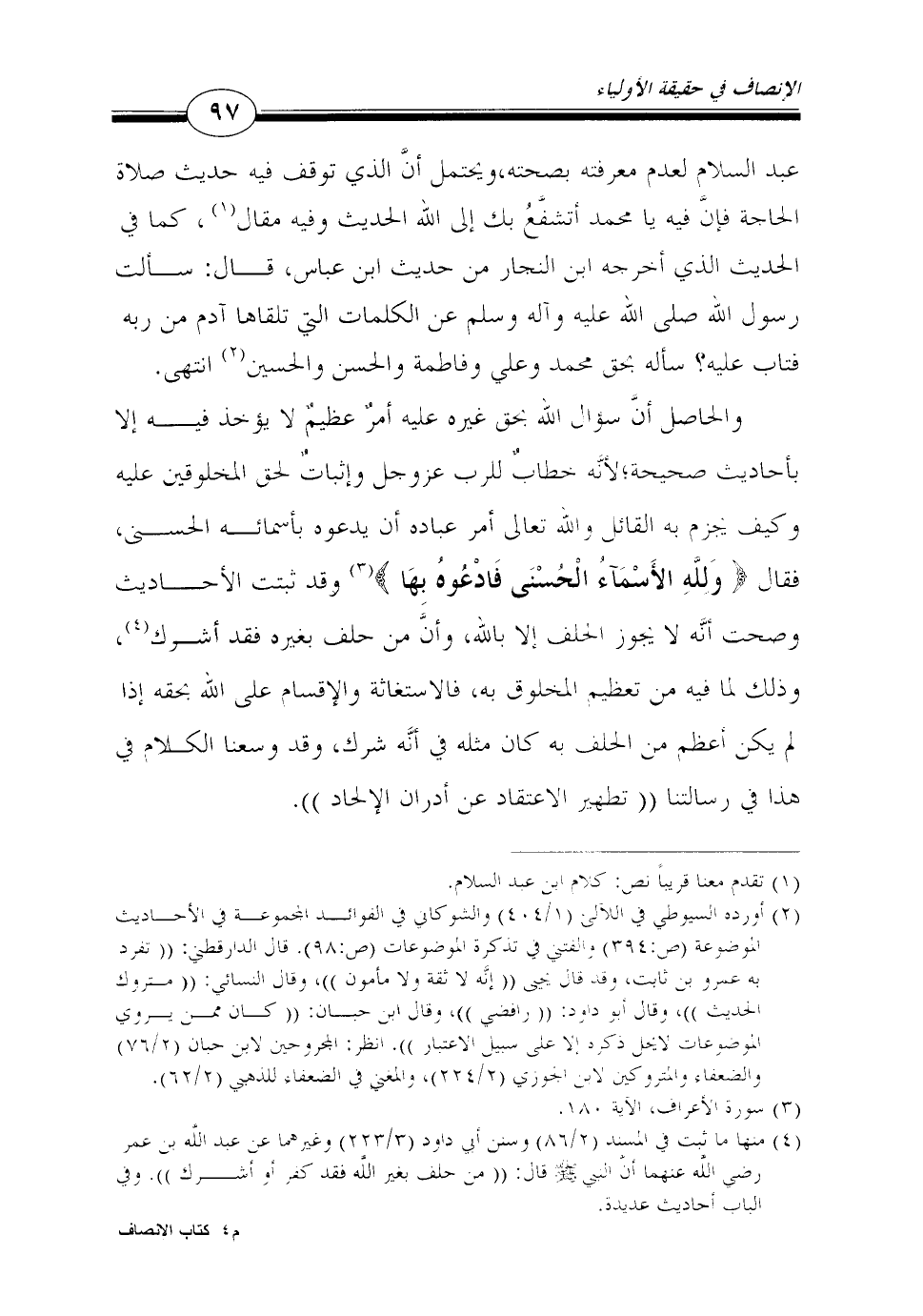 والحاصل أنَّ سؤال الله بحق غيره عليه أمرٌ عظيمٌ لا يؤخذ فيه إلا بأحاديث صحيحة؛ لأنَّه خطابٌ للرب عز وجل وإثباتٌ لحق المخلوقين عليه وكيف يجزم به القائل والله تعالى أمر عباده أن يدعوه بأسمائه الحسنى، فقال {وَلِلَّهِ الأَسْمَآءُ الْحُسْنَى فَادْعُوهُ بِهَا} 3 وقد ثبتت الأحاديث وصحت أنَّه لا يجوز الحلف إلا بالله، وأنَّ من حلف بغيره فقد أشرك4، وذلك لما فيه من تعظيم المخلوق به، فالاستغاثة والإقسام على الله بحقه إذا لم يكن أعظم من الحلف به كان مثله في أنَّه شرك، وقد وسعنا الكلام في هذا في رسالتنا "تطهير الاعتقاد عن أدران الإلحاد".